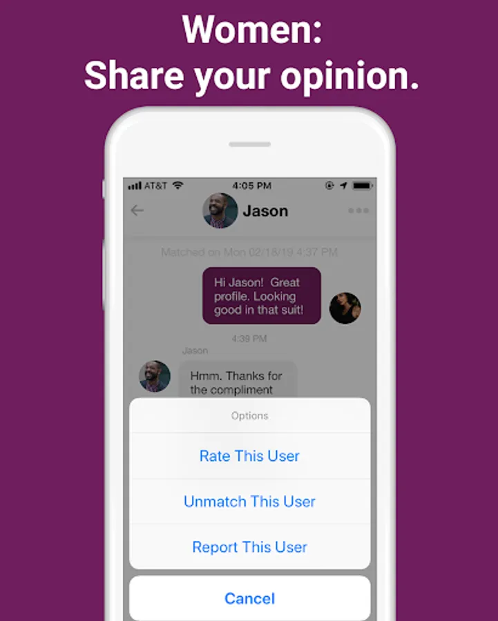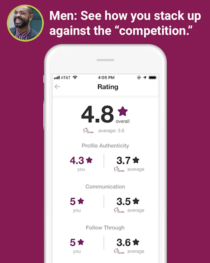 *Men are given a "My Ratings" field to access in their settings. This shows men their overall rating, and individual category ratings in each category as compared to the Plum averages.
