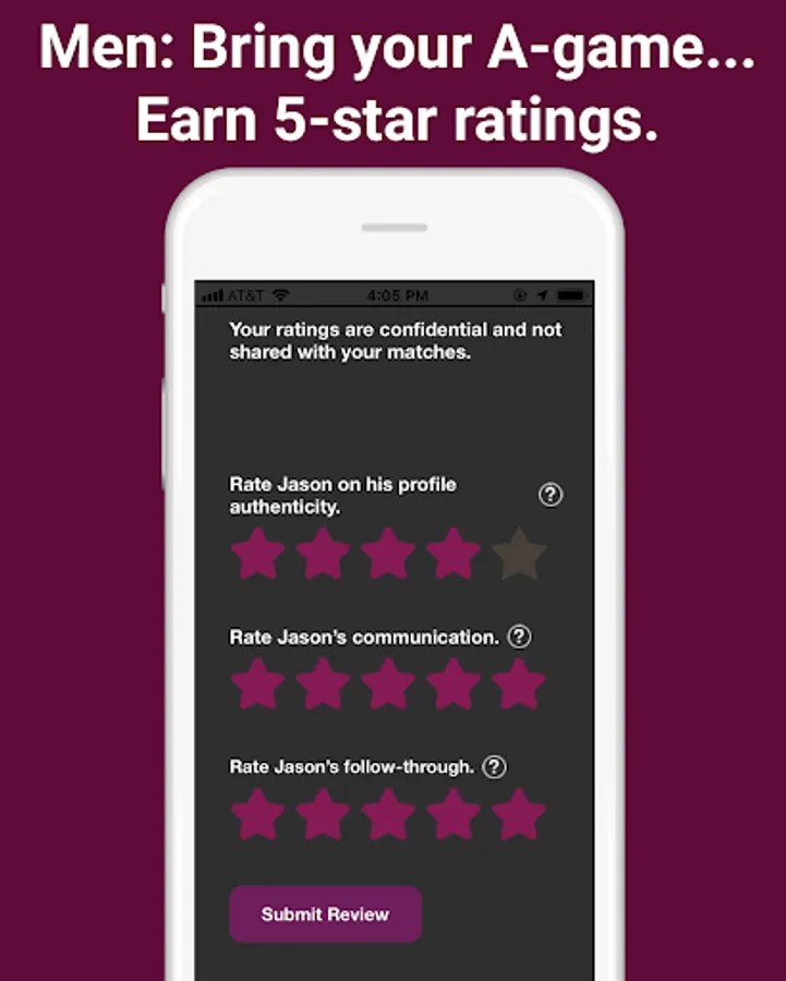 *Once matched, after communication begins, women seeking men, gain access to a rating tool for a LIMITED time that allows them to confidentially rate their match ONE time, 1-5 stars in up to three (3) categories: Profile Authenticity, Communication, and Follow-through. Written reviews are not allowed.