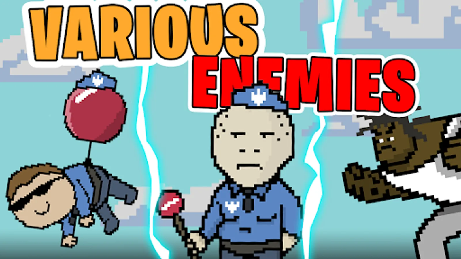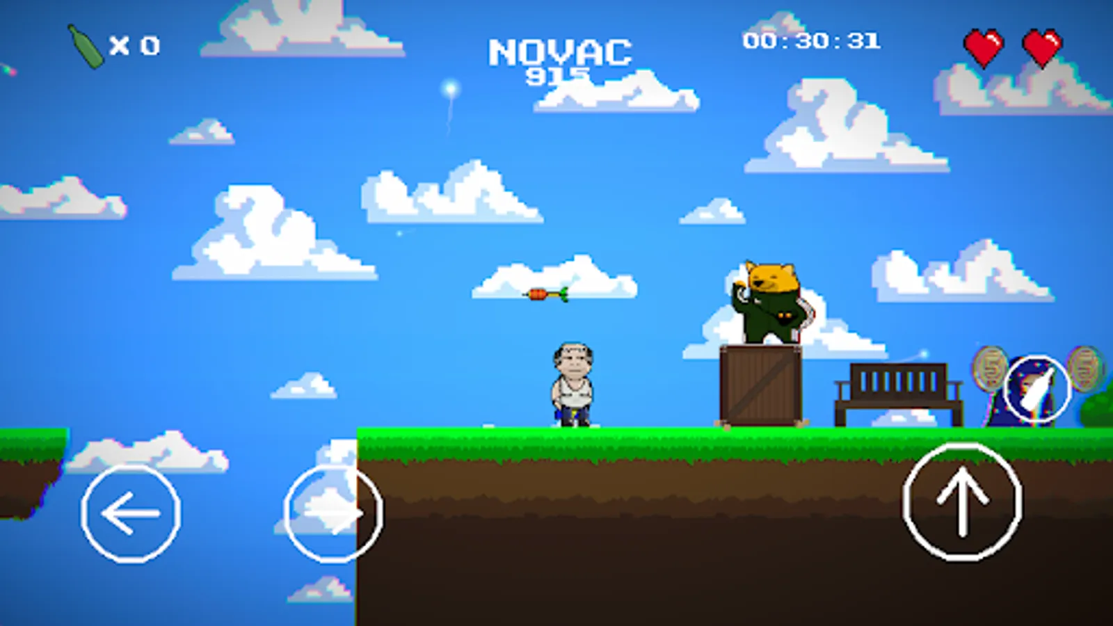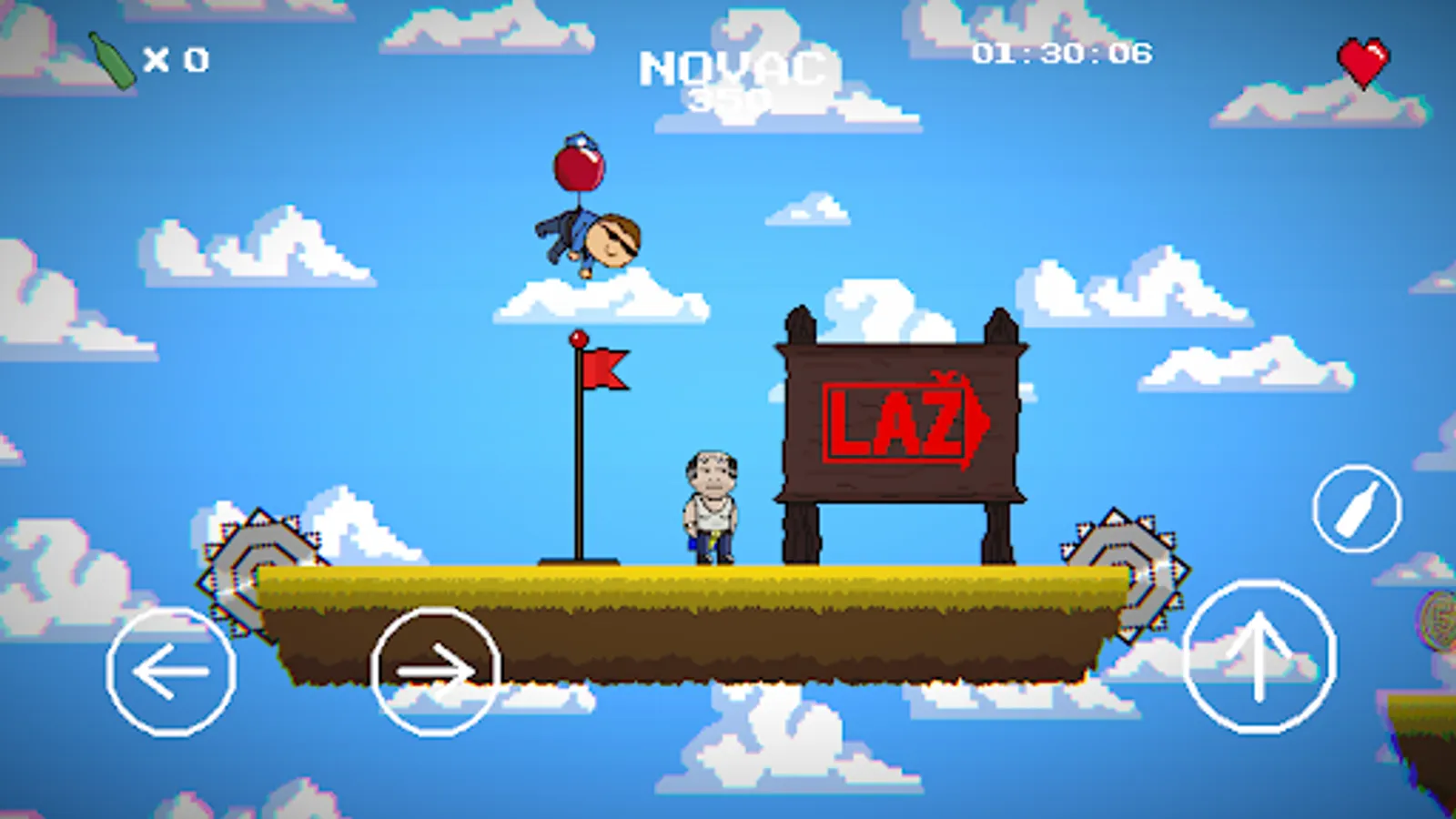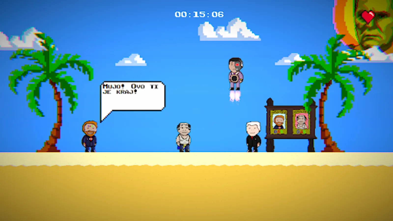 Get ready for an epic adventure in "The Mujo"! In this thrilling 2D pixel art platformer, your goal is to help the main character, Mujo, beat all the enemies and final bosses standing in your way as you make your way to the only sea coast in your country, and escape the matrix! Featuring challenging levels, intuitive controls, and colorful pixel art graphics, the adventure will keep you on the edge of your seat from start to finish. Take on a variety of enemies, ranging from very typical cops to flying cops, as you jump, dodge, and attack your way through each level. As you progress, you'll come across and collect glass bottles and burek to help you on your journey, and when you finally reach the end, you'll face off against the ultimate boss trio in a showdown for the ages. Can you emerge victorious and reach the coast? Help Mujo and find out!