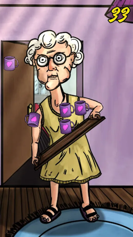 This dear grandma just wants to bring her cup of coffee into the living room. However, she trembles a bit, which is why her tray swings wildly back and forth. It's good that you're here now and helping her keep her balance.