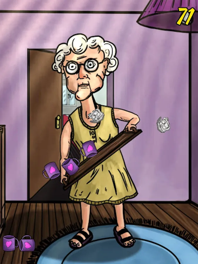 But it's not that easy. Her cheeky grandson throws cups, paper crumbs and for whatever reason bombs at the poor grandmother.