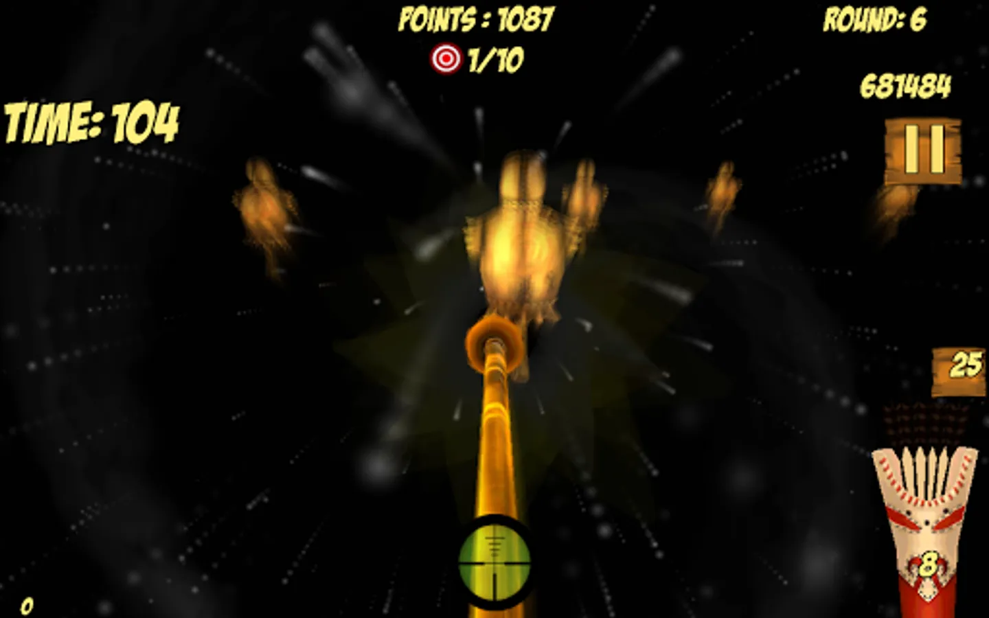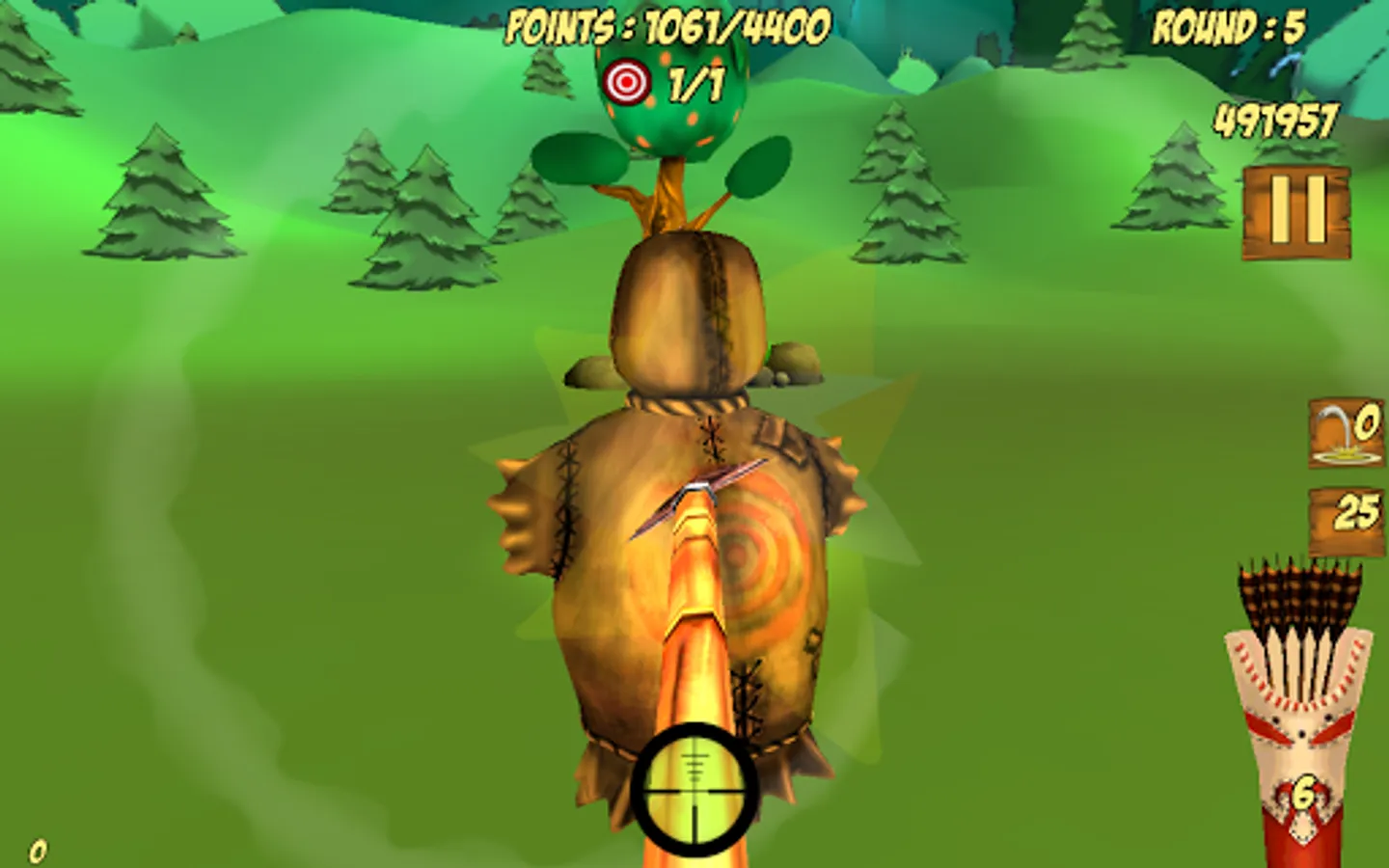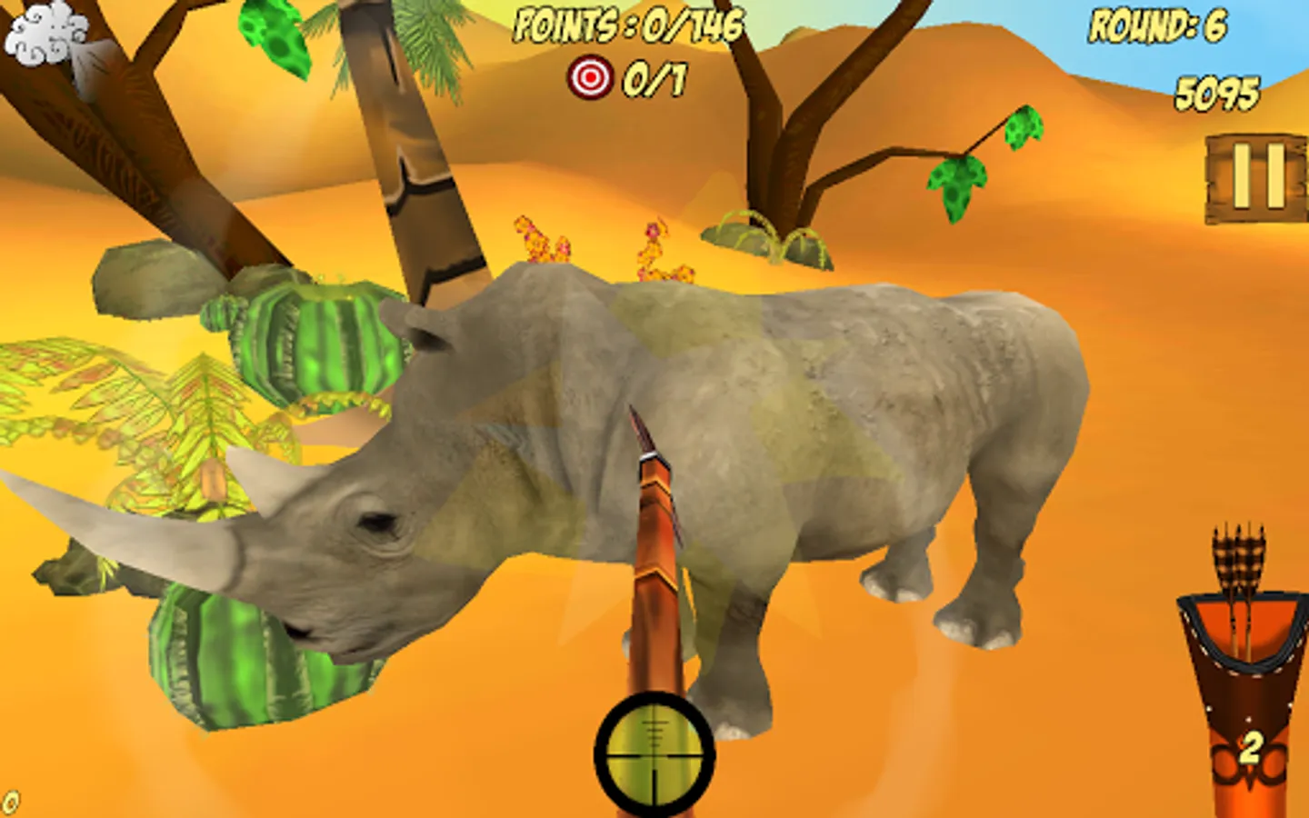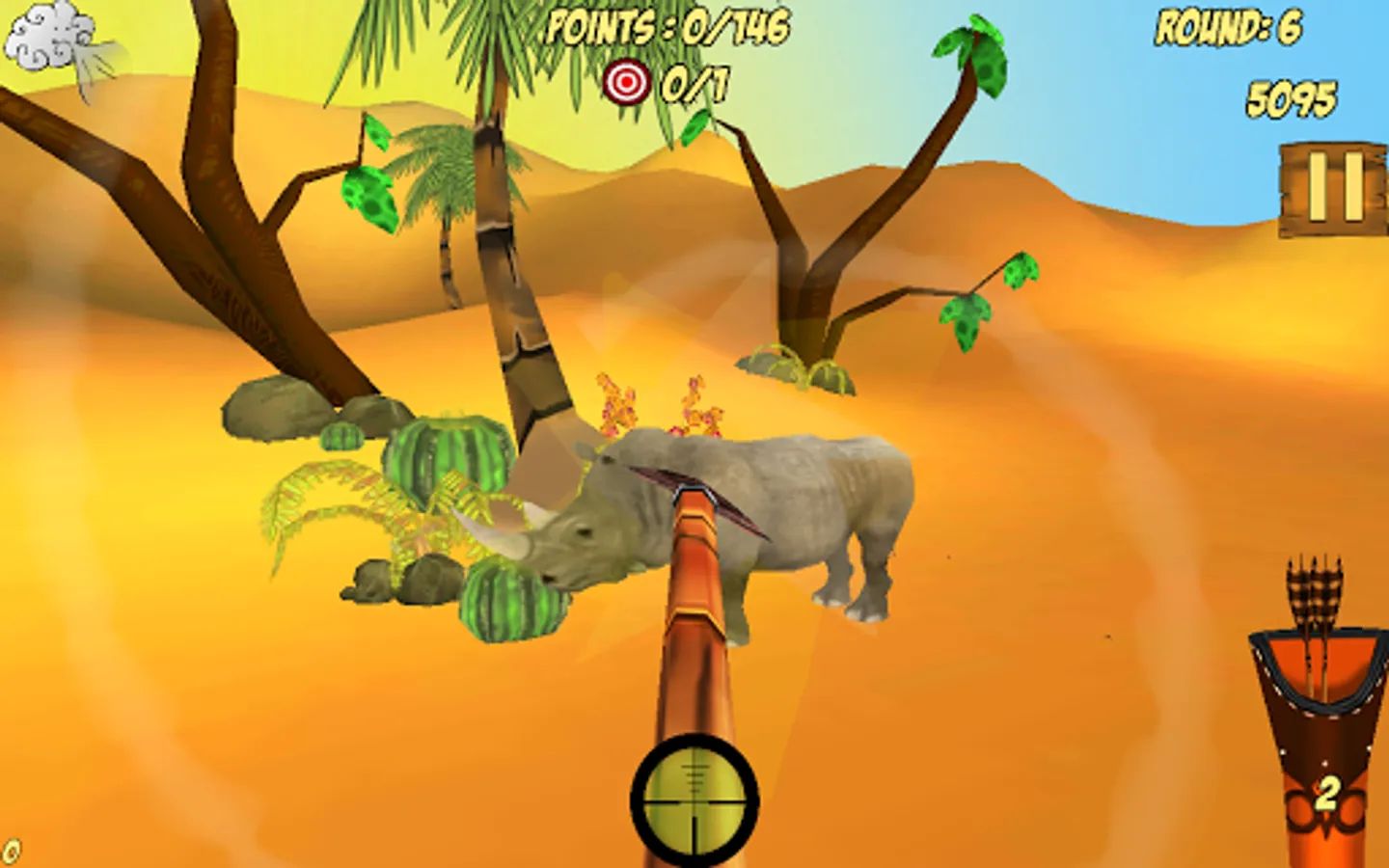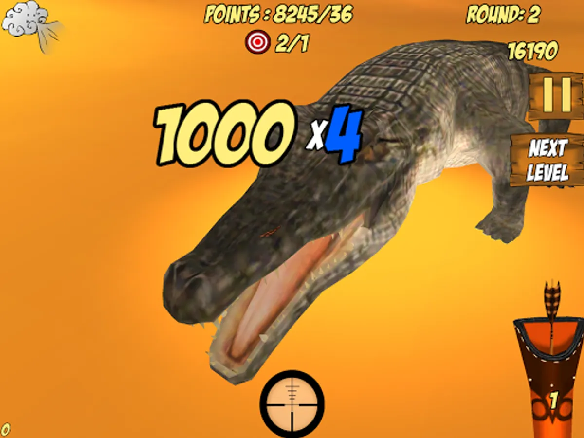 In Arrow Flick's other game modes, you are given five arrows per round, which are strategically flung at standing targets (make sure you hit all three), roving animals and dangling fruit. Gameplay unfolds in one of two landscapes, savanna or forest. The savanna is populated by lions, crocodiles and rhinos, while the forest is home to deer, bears and rabbits. In Arrow Flick, you are awarded points and special achievements (there are 183 of them) for hits, kill shots, bull’s eyes, headshots, tricks, even misses. If you stray too far from the mark, you can earn such achievements as stumblebum, klutz or spazoid. Ace your marks, however, and you may be deemed the next Robin Hood.