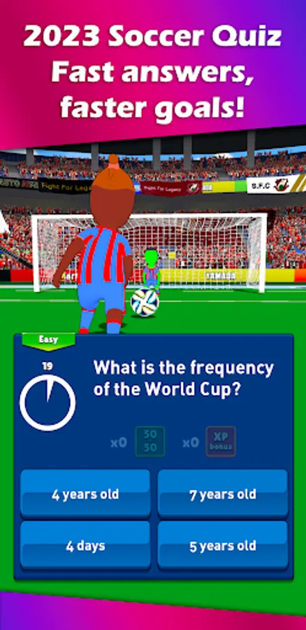 In Soccer Quiz: Trivia Football, speed and accuracy are key. Answer correctly and faster than your opponent, and you'll score a goal! Every goal counts in your quest to become the trivia football champion.