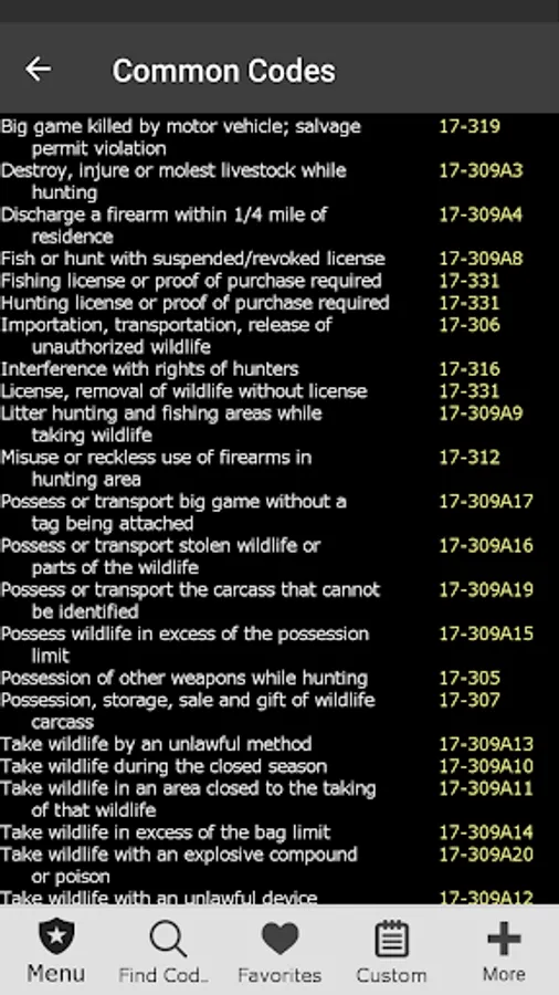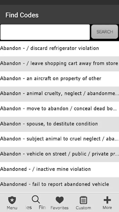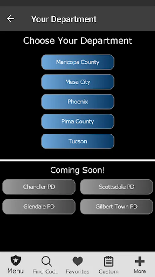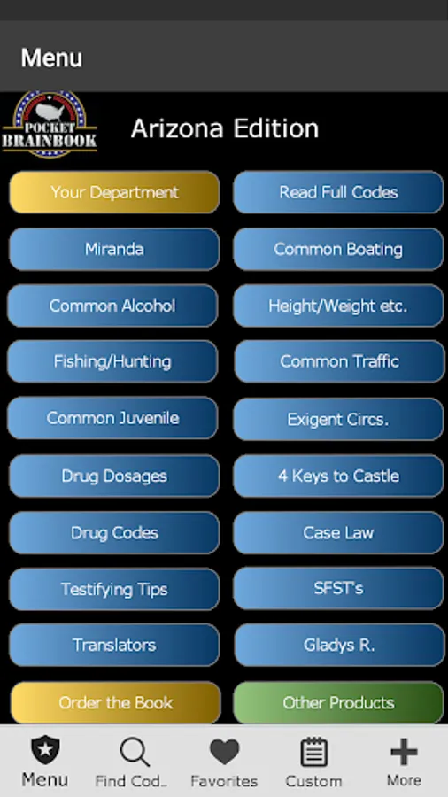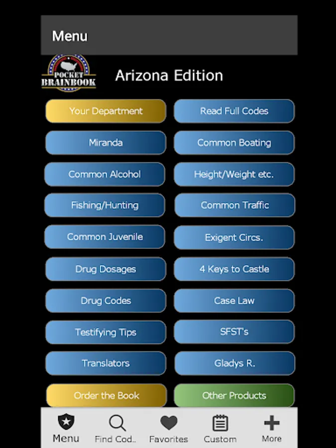 Designed for Arizona Police. This app was designed based on our popular pocket book version currently sold in AZ police stores. You can search Penal, Traffic, ABC, Health and Safety Laws by keyword or browse Codes. It has Miranda, narcotic codes, Drug symptomology domestic violence codes, translator cheat sheets for 6 different languages, vehicle theft info, and so much more. We have also included a custom section to add your own department information (ie. Municipal codes, radio codes, policies, etc.) This app can also be customized to your specific Police Department.