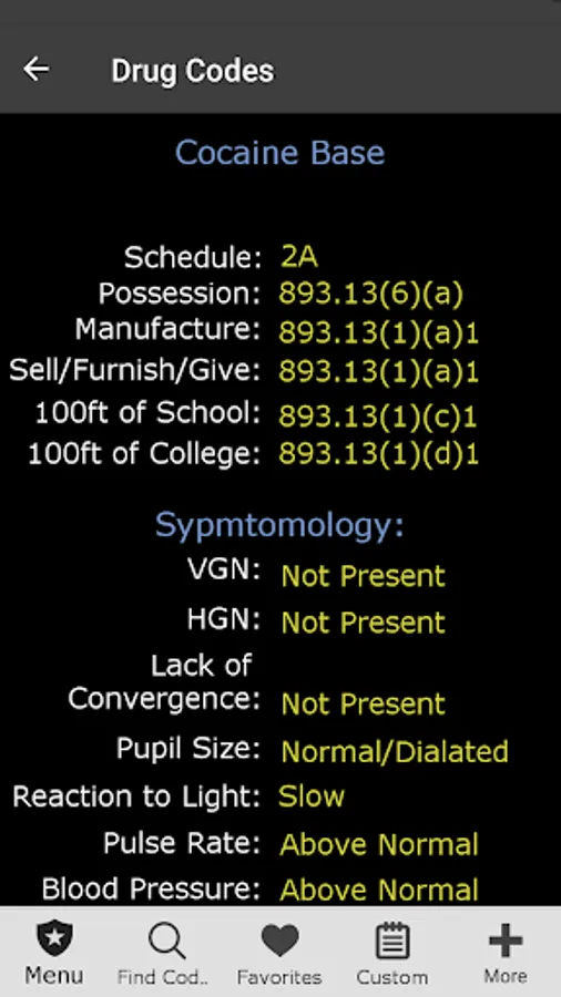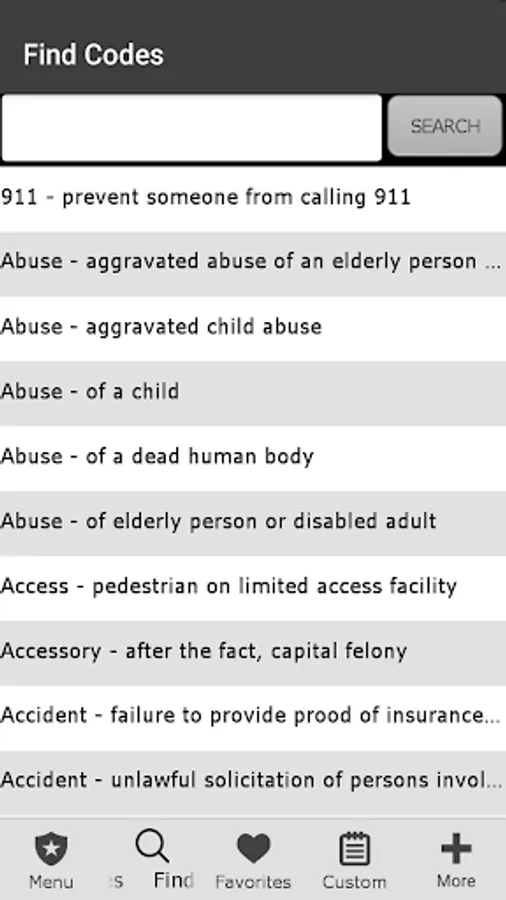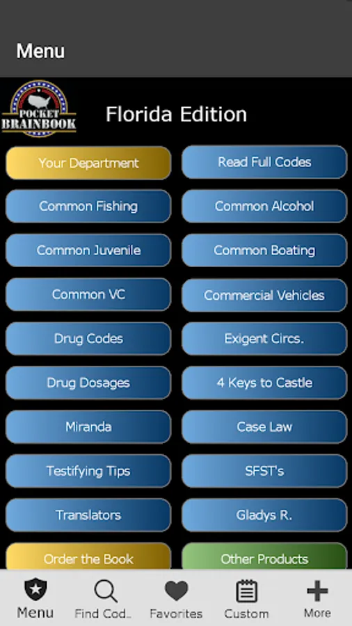 Designed for Florida Police. This app was designed based on our popular pocket book version currently sold in FL police stores. You can search Penal, Traffic, ABC, Health and Safety Laws by keyword or browse Codes. It has Miranda, narcotic codes, Drug symptomology domestic violence codes, translator cheat sheets for 6 different languages, vehicle theft info, and so much more. We have also included a custom section to add your own department information (ie. Municipal codes, radio codes, policies, etc.) This app can also be customized to your specific Police Department.