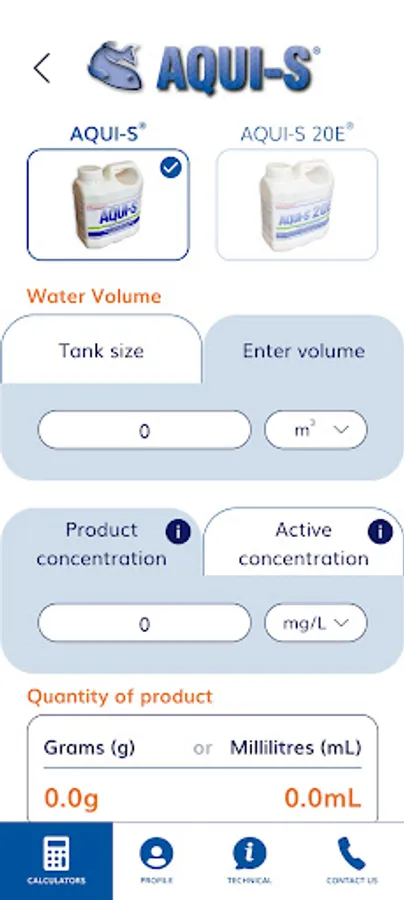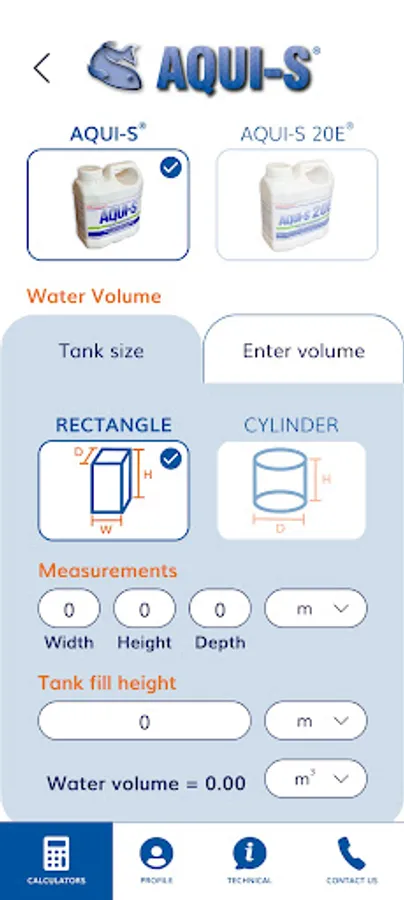 The AQUI-S® Calculator App has been designed to help you calculate the volume of AQUI-S® required for your tank environment. AQUI-S volumes calculated in this app should be used as a guide only, with visual observations of the fish’s stage of sedation still being your best tool when assessing fish welfare and sedation success. The app can also be used to calculate your tank volume (both rectangular and circular tanks) and can be used to access technical notes or contact a local distributor.