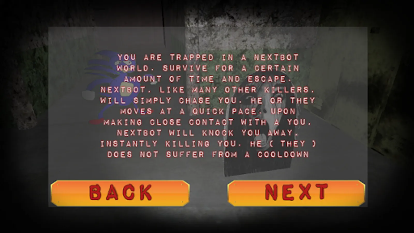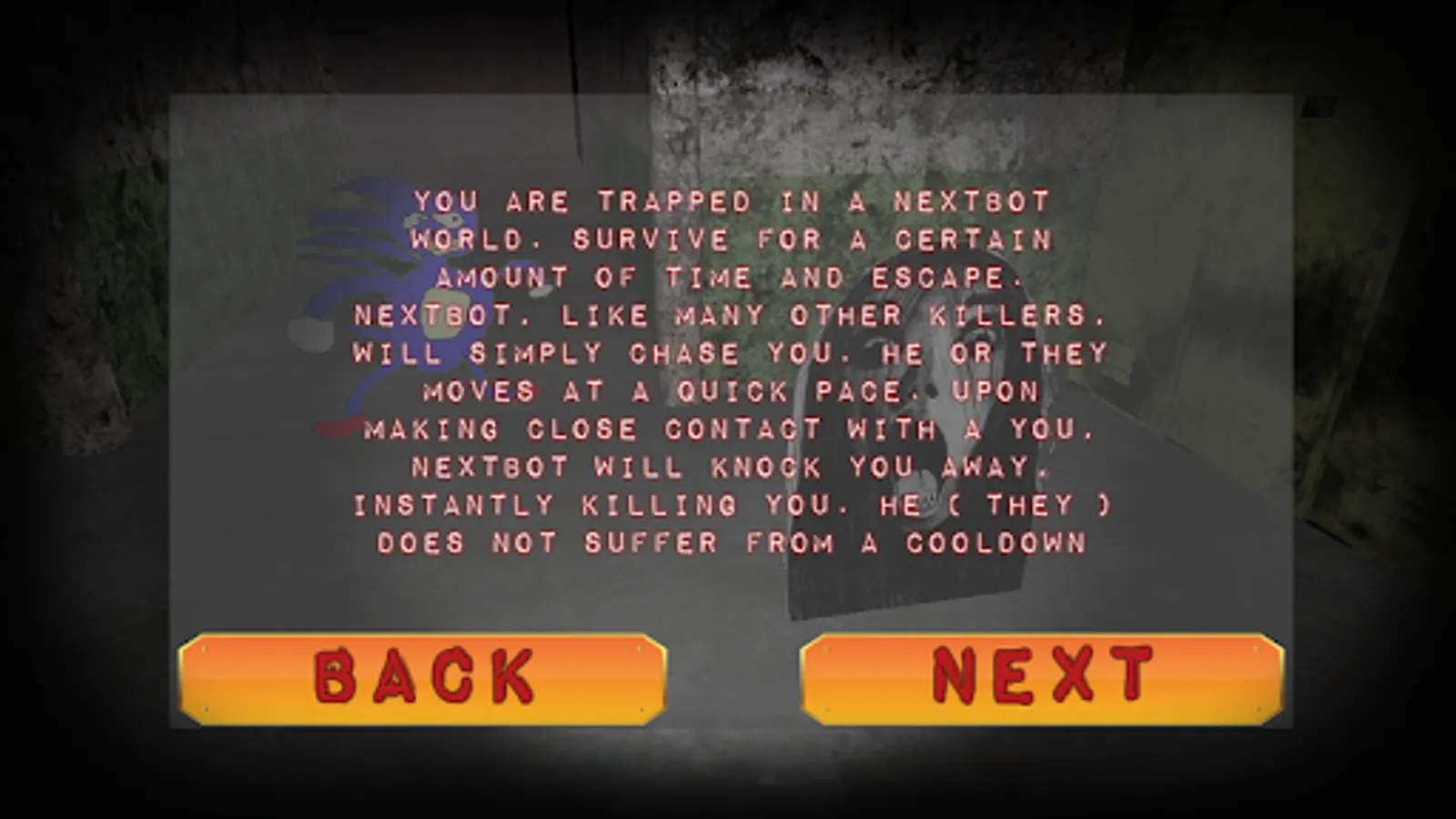 Nextbot, like many other killers, will simply chase you. He or they moves at a quick pace. Upon making close contact with a you, Nextbot will knock you away, instantly killing you. He ( they ) does not suffer from a cooldown and can wipe out multiple humans at once.