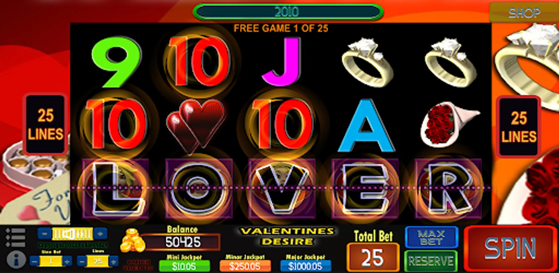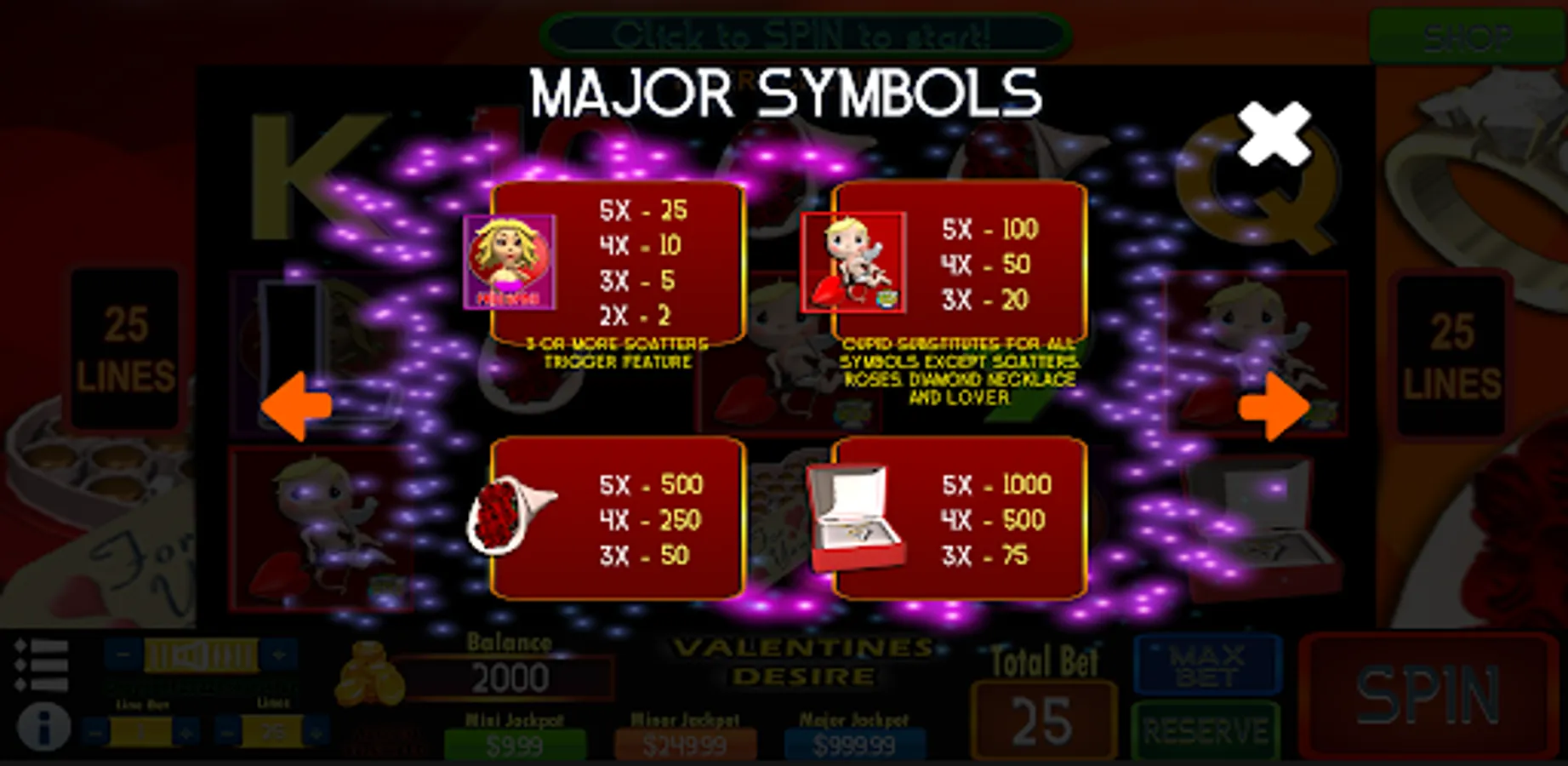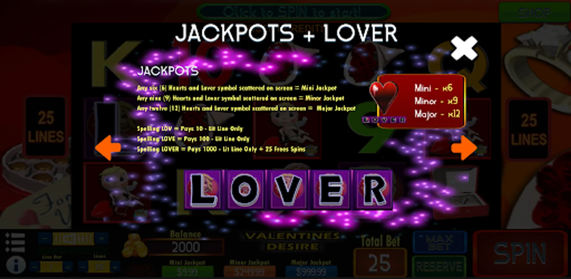 Valentines Desire is a 5 reel, 25 pay line slot machine (pokie) with a Valentines theme oriented from left to right.
