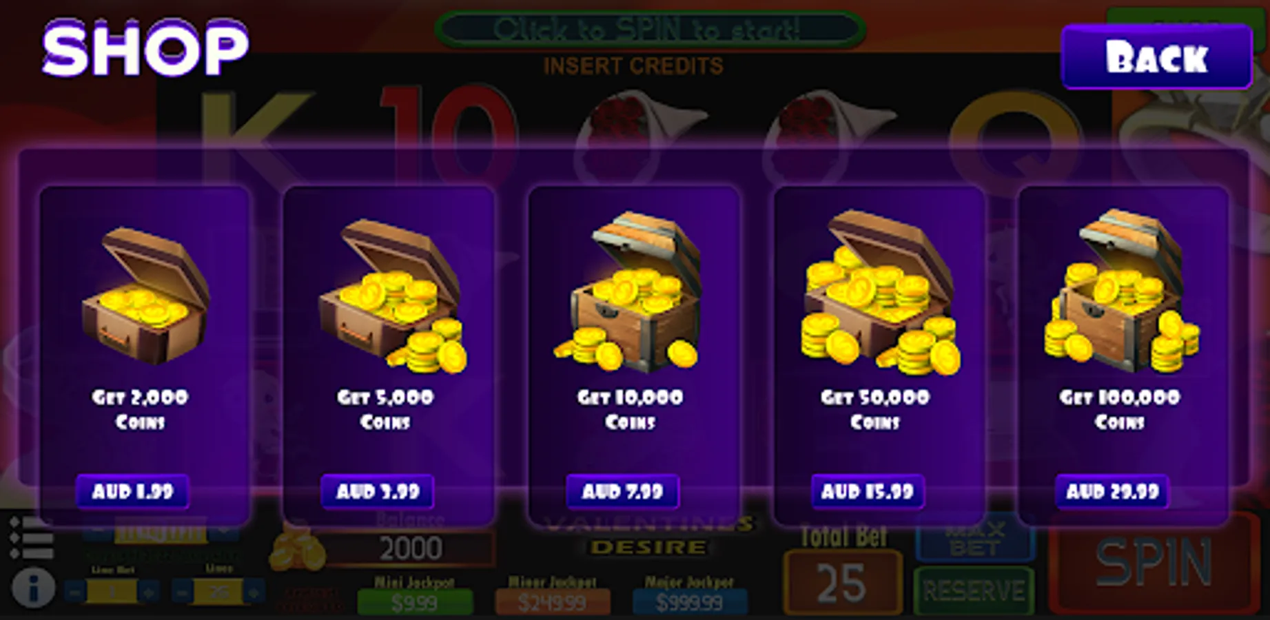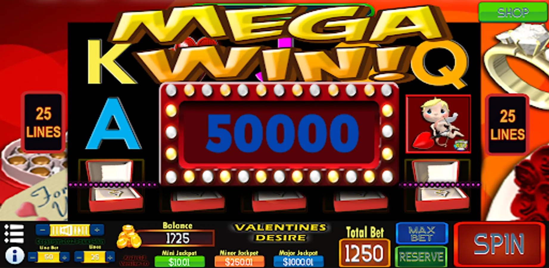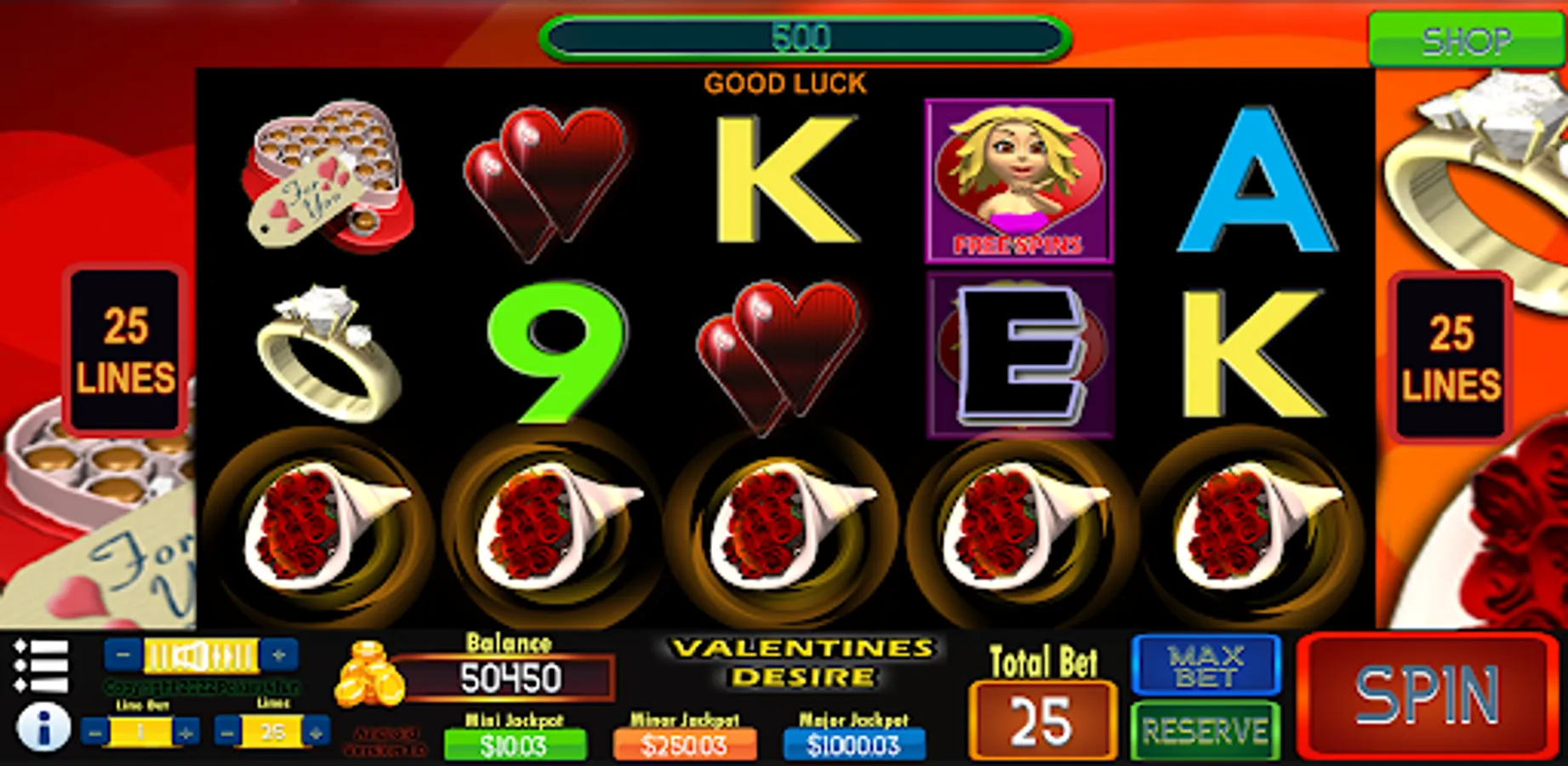 Valentines Desire is a 5 reel, 25 pay line slot machine (pokie) with a Valentines theme oriented from left to right.