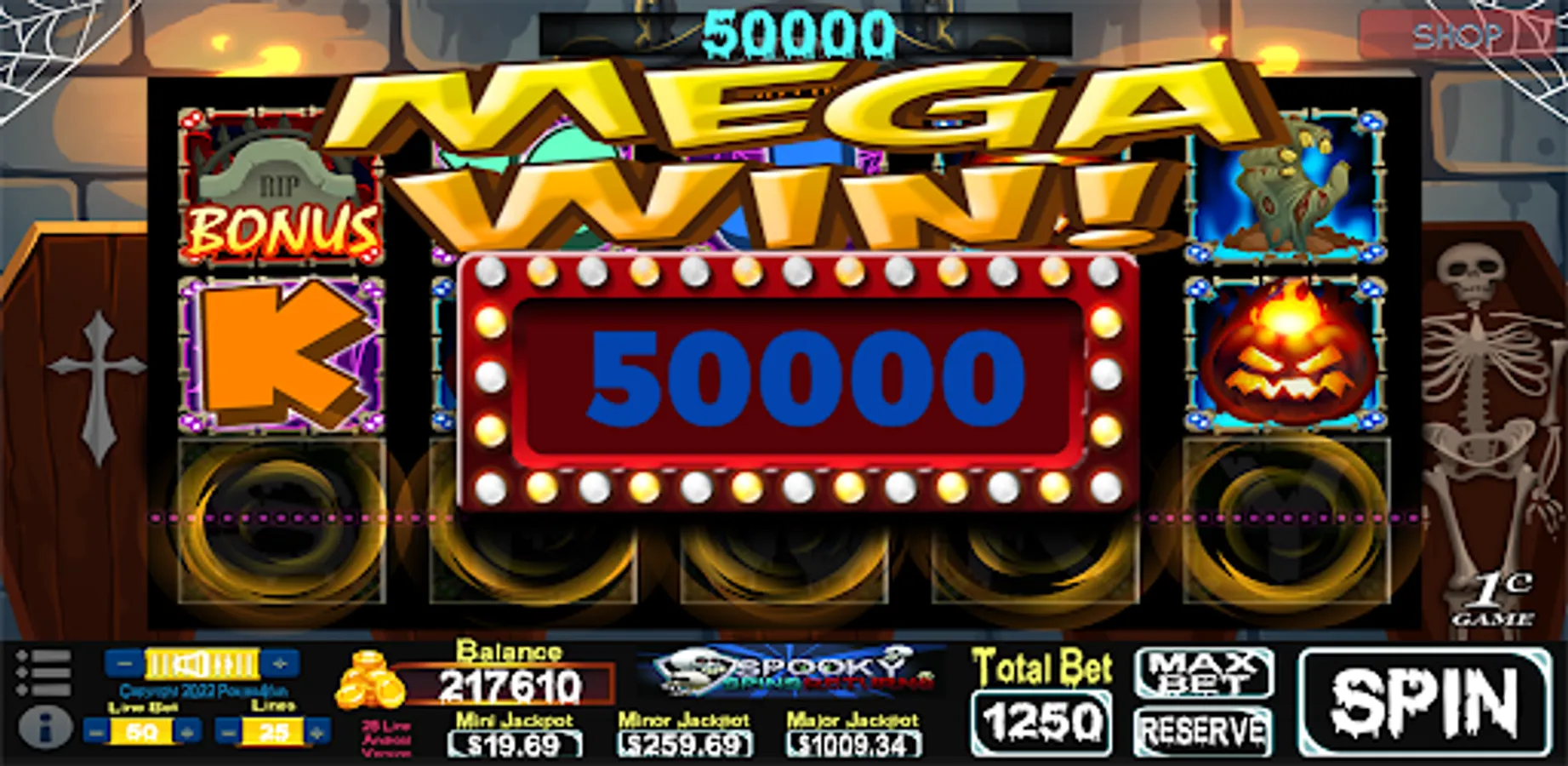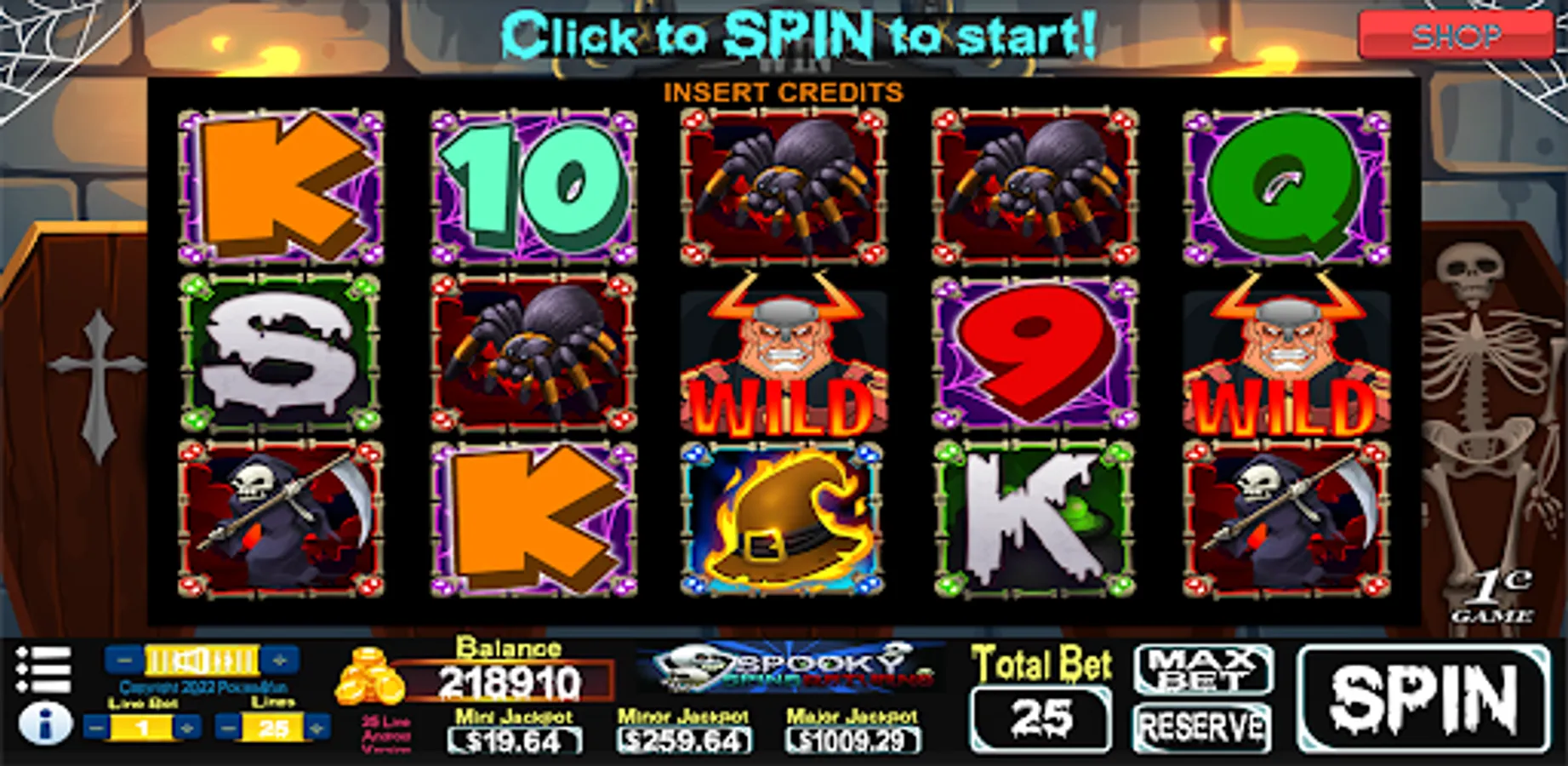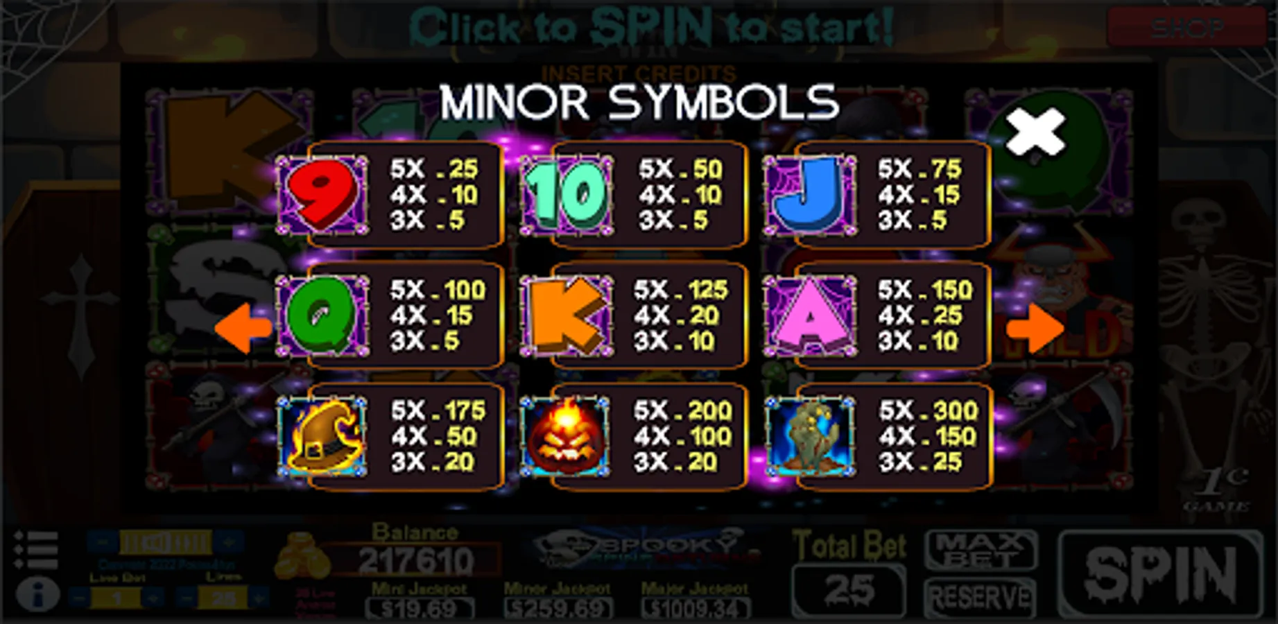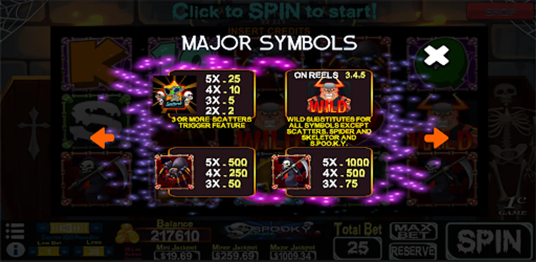 Spooky Spins Returns is a 5 reel, 25 pay line slot machine (pokie) with a Horror theme oriented from left to right.