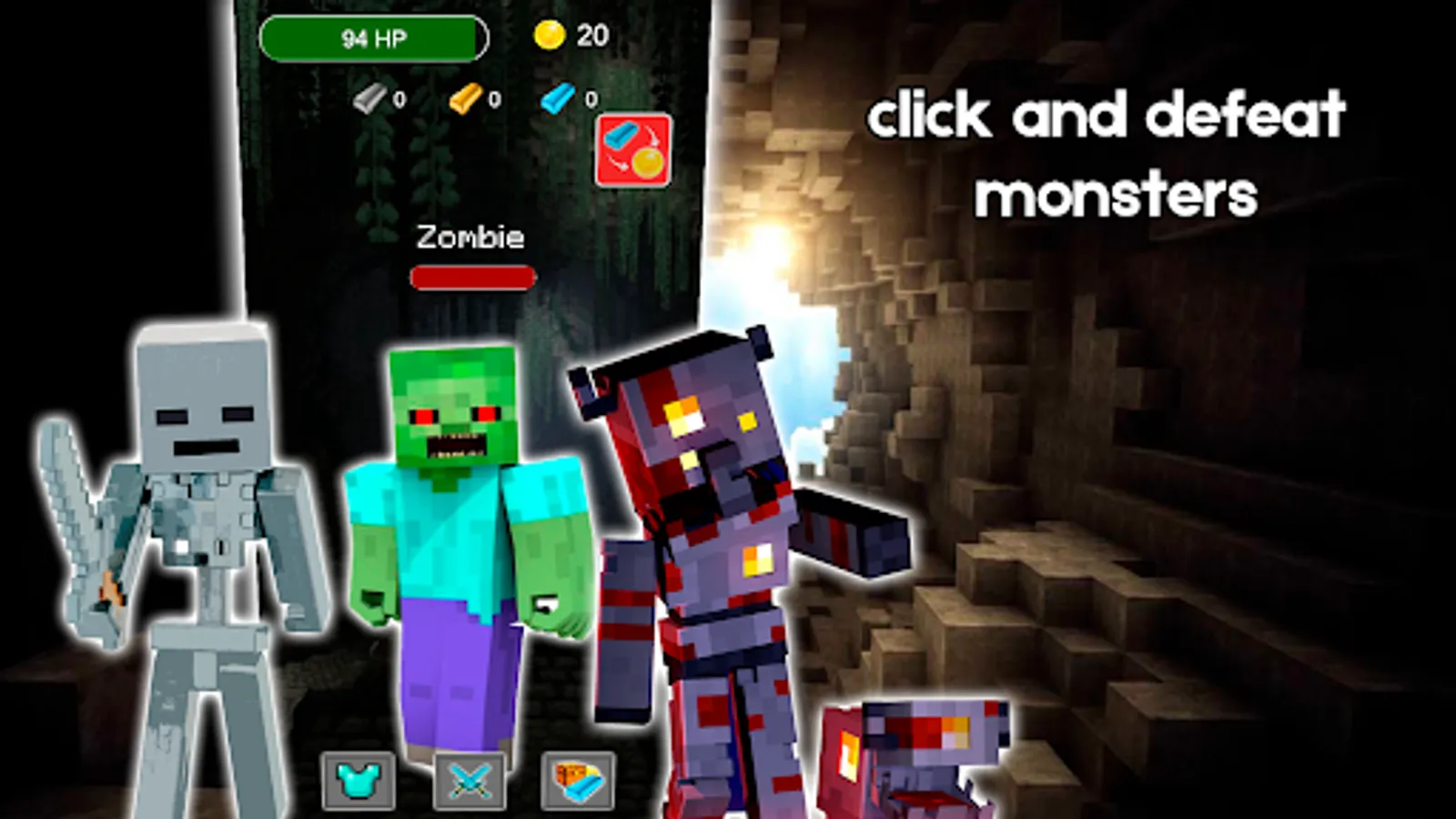 Mine Clicker: Monster Hunter is an idle clicker with fight mechanics and crafting. Also, there is an adventure, where you can fight zombies and other monsters and