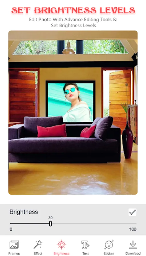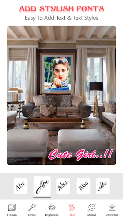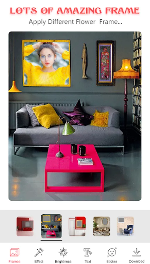 Select any photo / picture from gallery or take a picture using camera and embed the photo of your choice into beautiful Interior photo frames. You can easily apply different photo effects or decorate with photo editing tool.