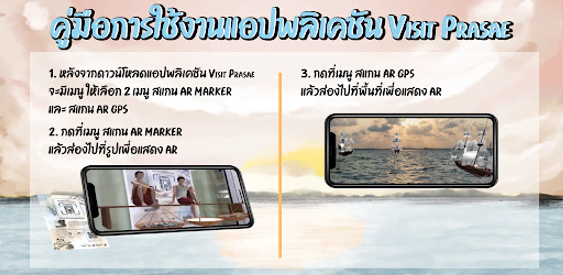 Visit Prasae is an AR (Augmented Reality) application that collects and presents a virtual waterfront lifestyle in the past of Pak Nam Prasae community. A port city on the eastern seaboard with abundance of natural resources. Traditions of the townspeople when fishing The only tradition in Thailand A former port city that served as a point of loading and unloading of goods and a memorial to HTMS Prasae, another pride of the Royal Thai Navy in the Korean War.