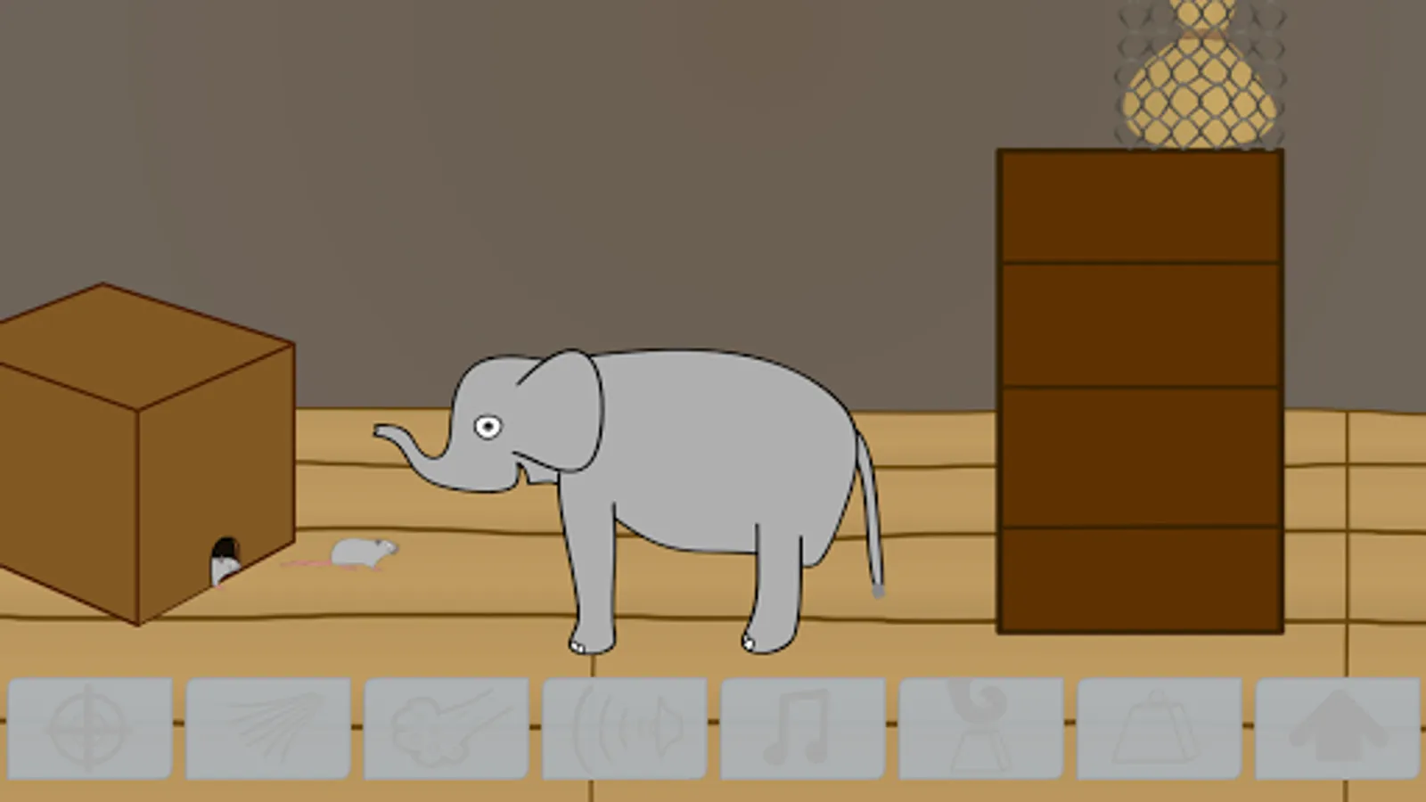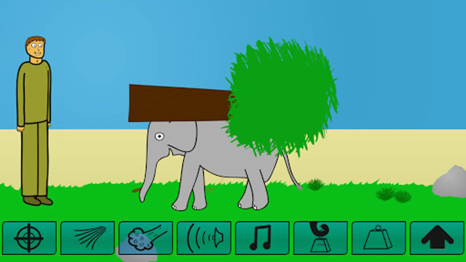 The elephant can shoot things, blow them away or towards him, shout, make music, carry objects, jump, and turn if you click on him.
