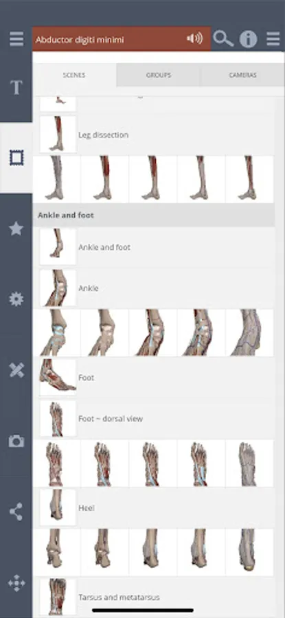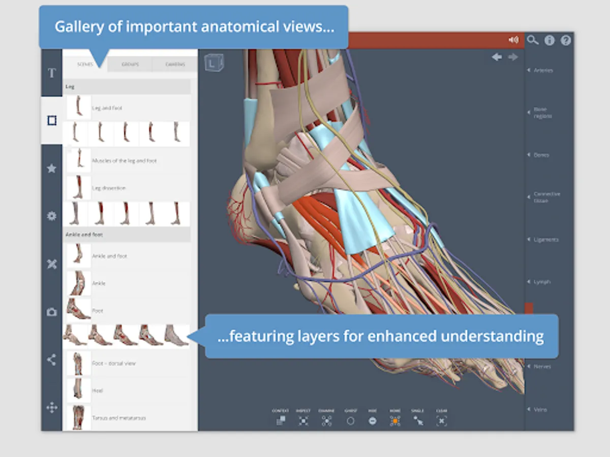 • The Gallery contains 13 pre-set scenes, designed by an in-house team of anatomical experts, to clearly and comprehensibly present in-depth regional and systemic anatomy of the foot. Each scene is divided into five layers to provide greater control over the depth of anatomy shown; making tailoring the anatomy you want to see simple and quick.