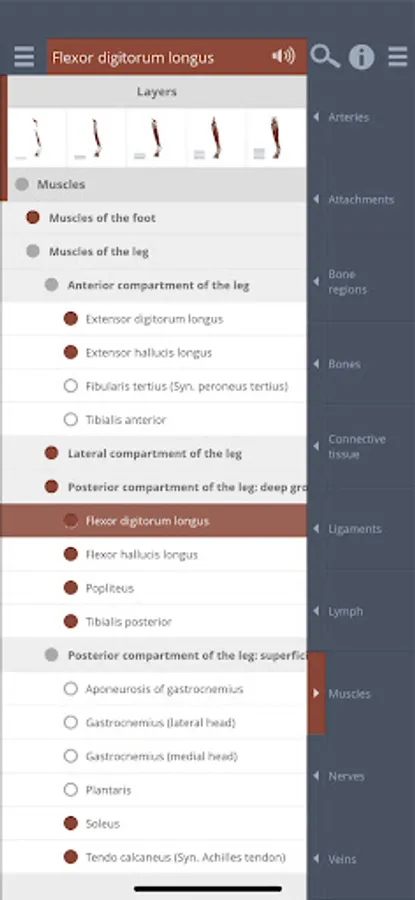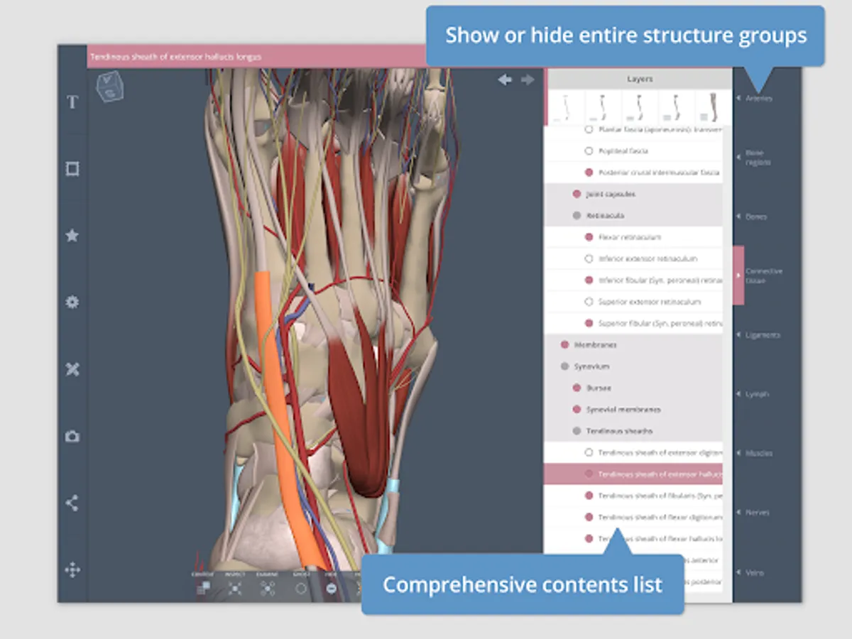 • The Contents folders arrange all 499 structures systemically, meaning you can browse by subcategory and switch all related structures on at once. It provides an excellent learning tool – for example turn on all branches of the lateral tarsal artery, or the muscles of the lateral compartment of the leg.