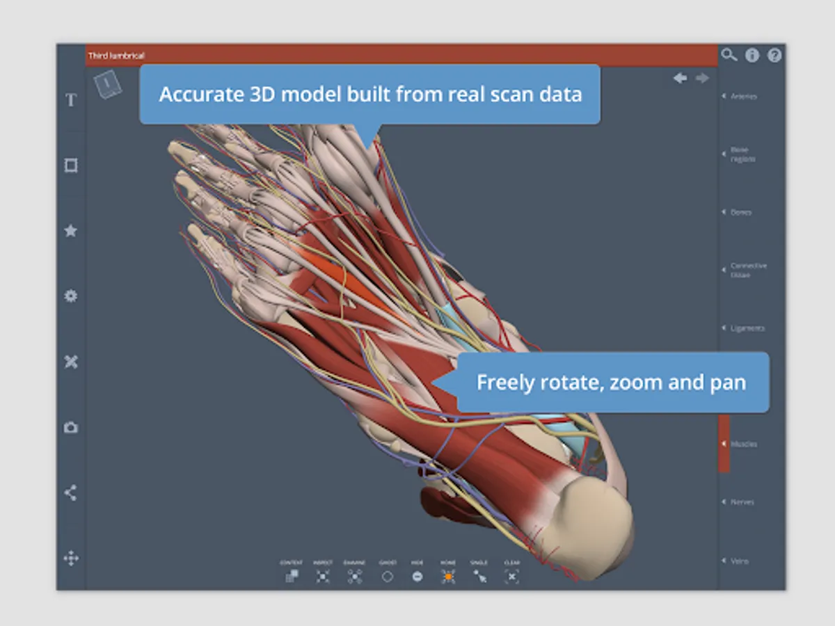 Primal's 3D Real-time Human Anatomy app for the Foot is the ultimate 3D interactive anatomy viewer for all medical educators, practitioners and students. Meticulously built over ten years from high-resolution cross-sectional photographs of real cadavers, the app provides an accurate and visually stunning reconstruction of the anatomy of the foot.