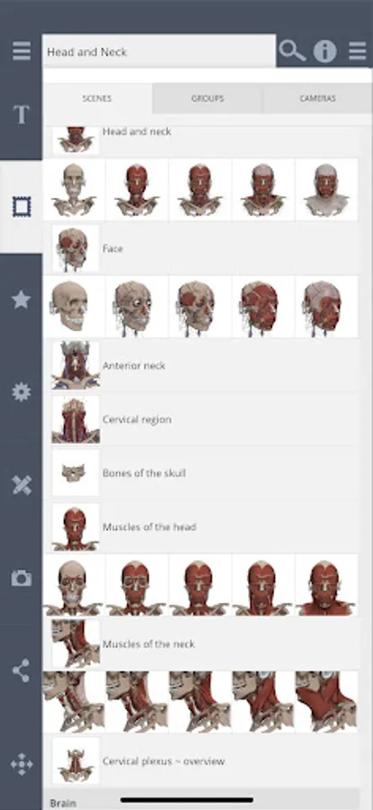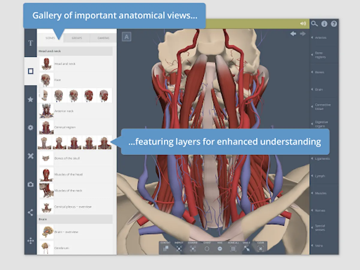 • The Gallery contains 41 pre-set scenes, designed by an in-house team of anatomical experts, to clearly and comprehensibly present in-depth regional and systemic anatomy of the head. Each scene is divided into five layers to provide greater control over the depth of anatomy shown; making tailoring the anatomy you want to see simple and quick.