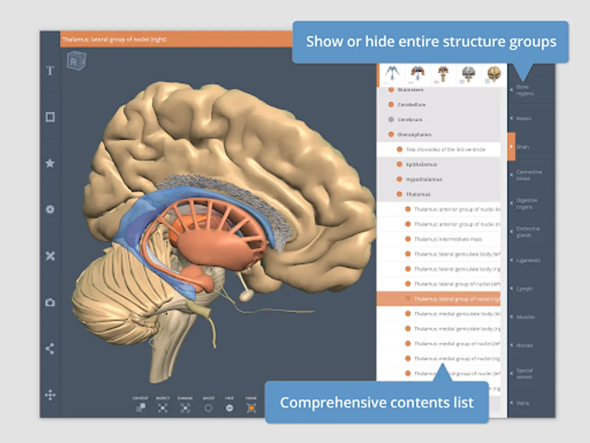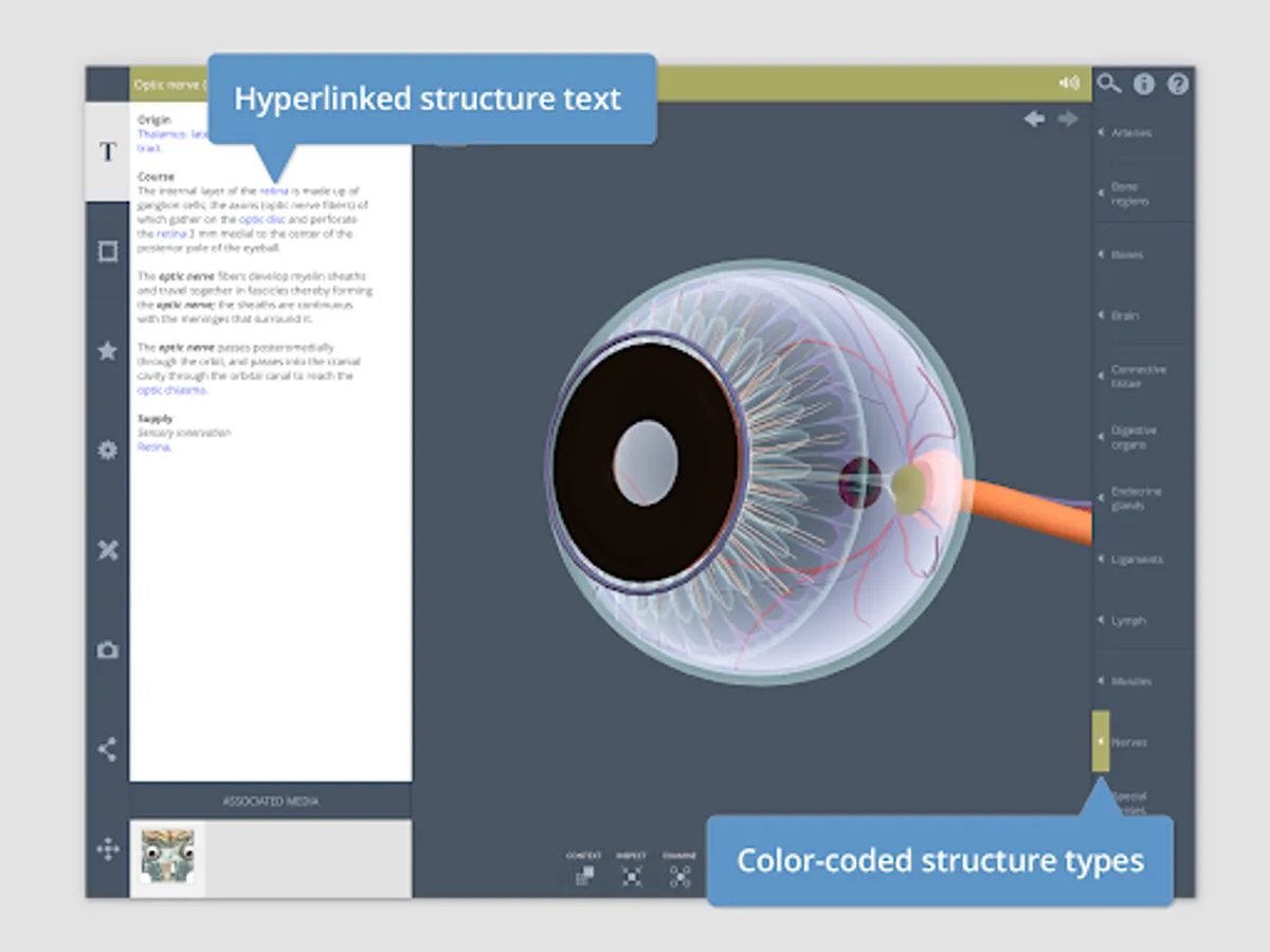 See each structure in context with the anatomy that surrounds it. Explore these relationships and easily navigate to related anatomical structures to expand your learning. Select a field name in the right-hand menu to show the anatomical category and sub-category of the structure for added understanding and simple navigation.