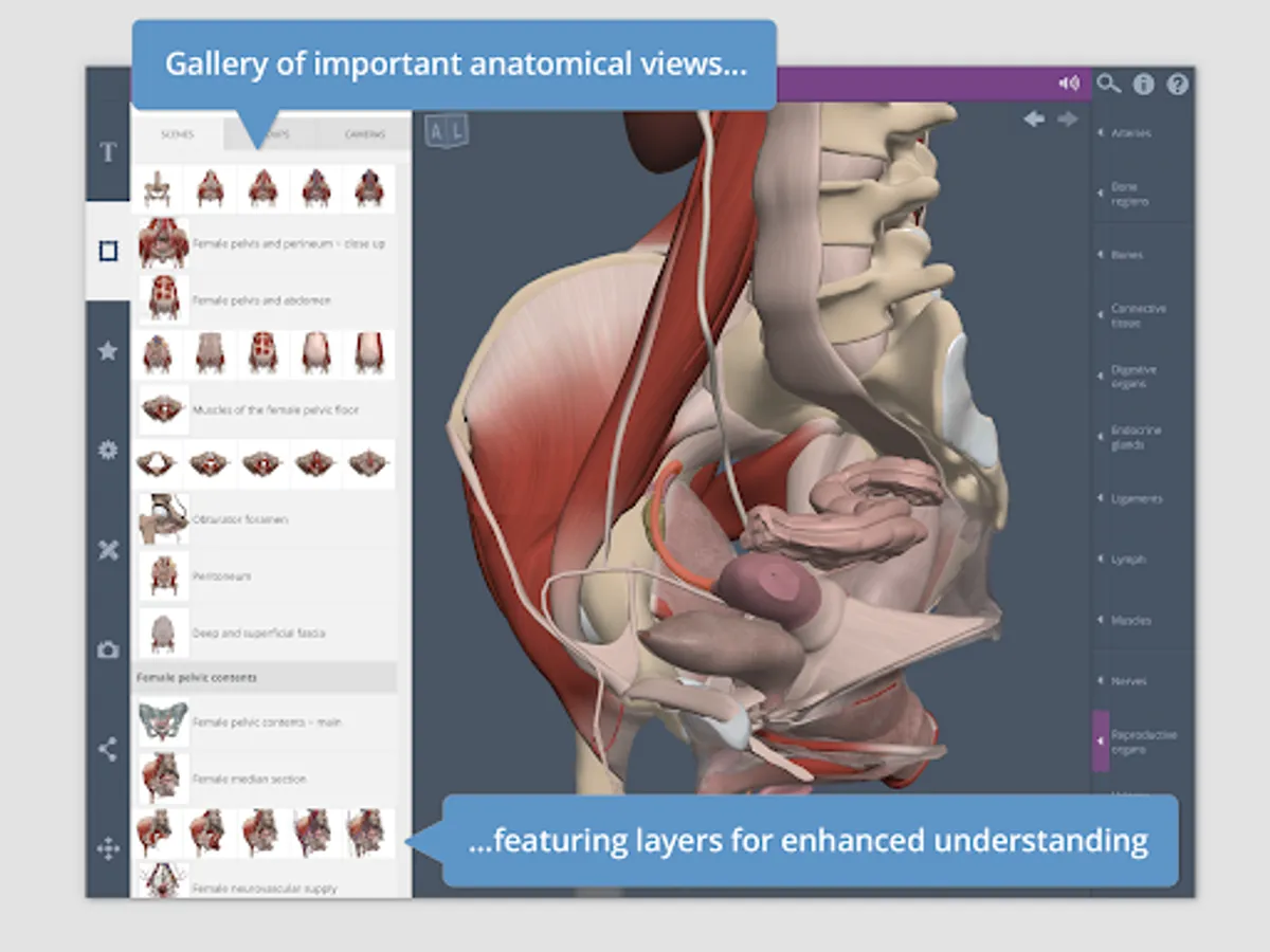 • The Gallery contains 23 pre-set scenes, designed by an in-house team of anatomical experts, to clearly and comprehensibly present in-depth regional and systemic anatomy of the female pelvis. Each scene is divided into five layers to provide greater control over the depth of anatomy shown; making tailoring the anatomy you want to see simple and quick.