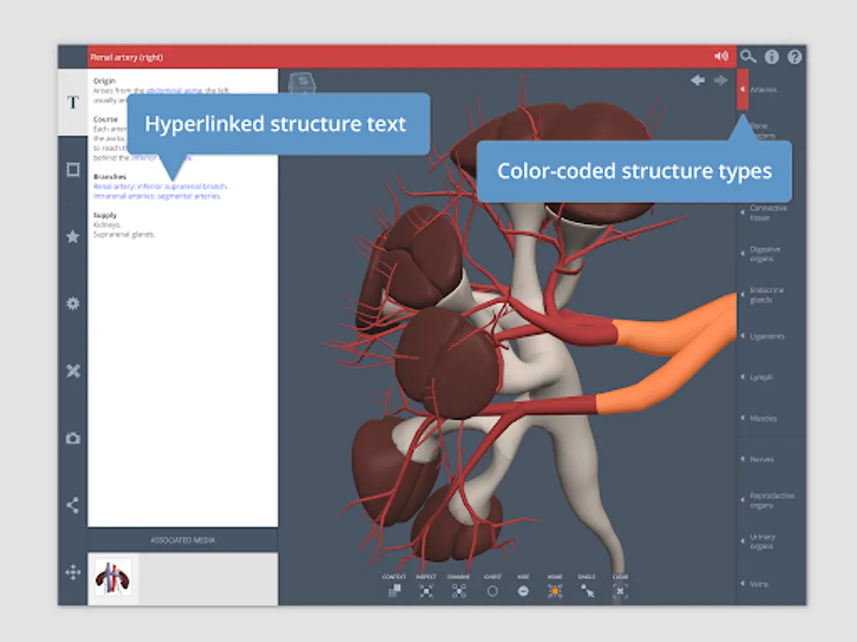 See each structure in context with the anatomy that surrounds it. Explore these relationships and easily navigate to related anatomical structures to expand your learning. Select a field name in the right-hand menu to show the anatomical category and sub-category of the structure for added understanding and simple navigation.