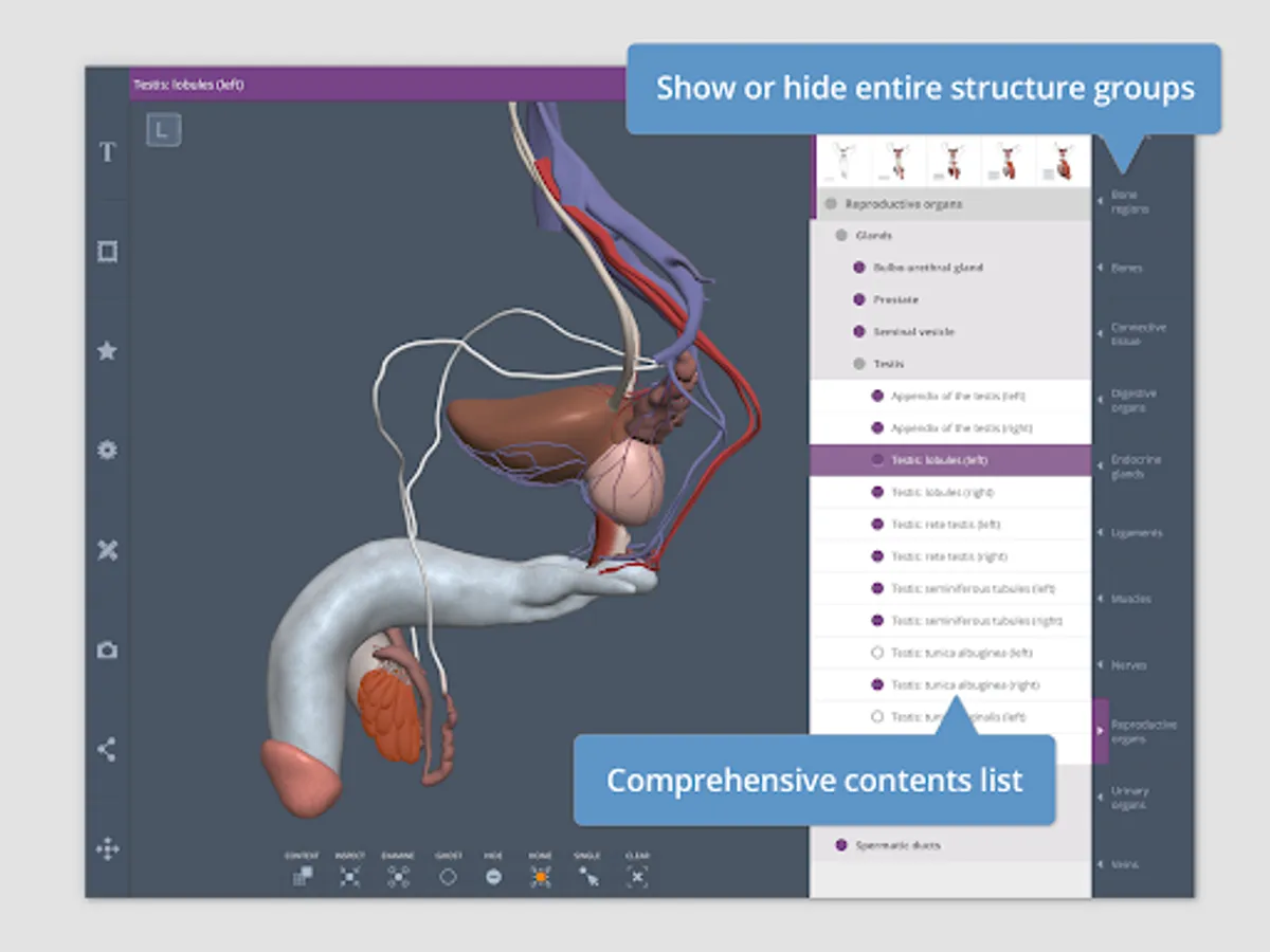• The Contents folders arrange all 405 structures systemically, meaning you can browse by subcategory and switch all related structures on at once. It provides an excellent learning tool – for example turn on all branches of the internal iliac artery, or the muscles of the perineum.