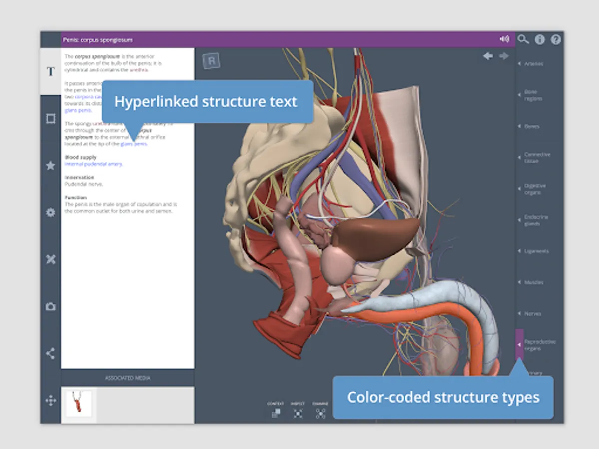 Read detailed and accurate text for each structure using the T icon, and in a feature unique to Primal Pictures, each anatomical term in the text is linked to the appropriate model in the 3D model. Selecting these links will highlight the relevant structures, bringing the text to life and make learning anatomy more visual and immediate.