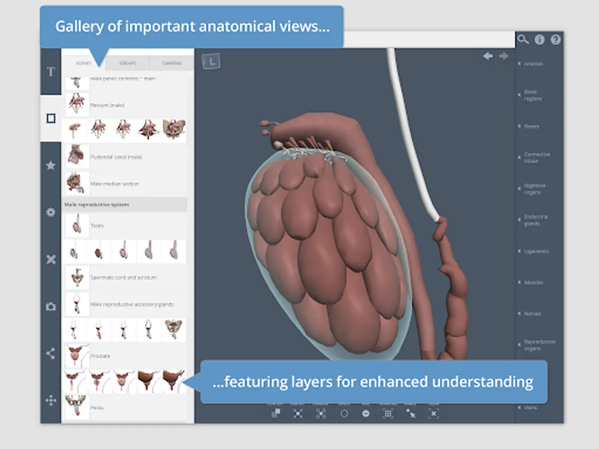• The Gallery contains 13 pre-set scenes, designed by an in-house team of anatomical experts, to clearly and comprehensibly present in-depth regional and systemic anatomy of the male pelvis. Each scene is divided into five layers to provide greater control over the depth of anatomy shown; making tailoring the anatomy you want to see simple and quick.