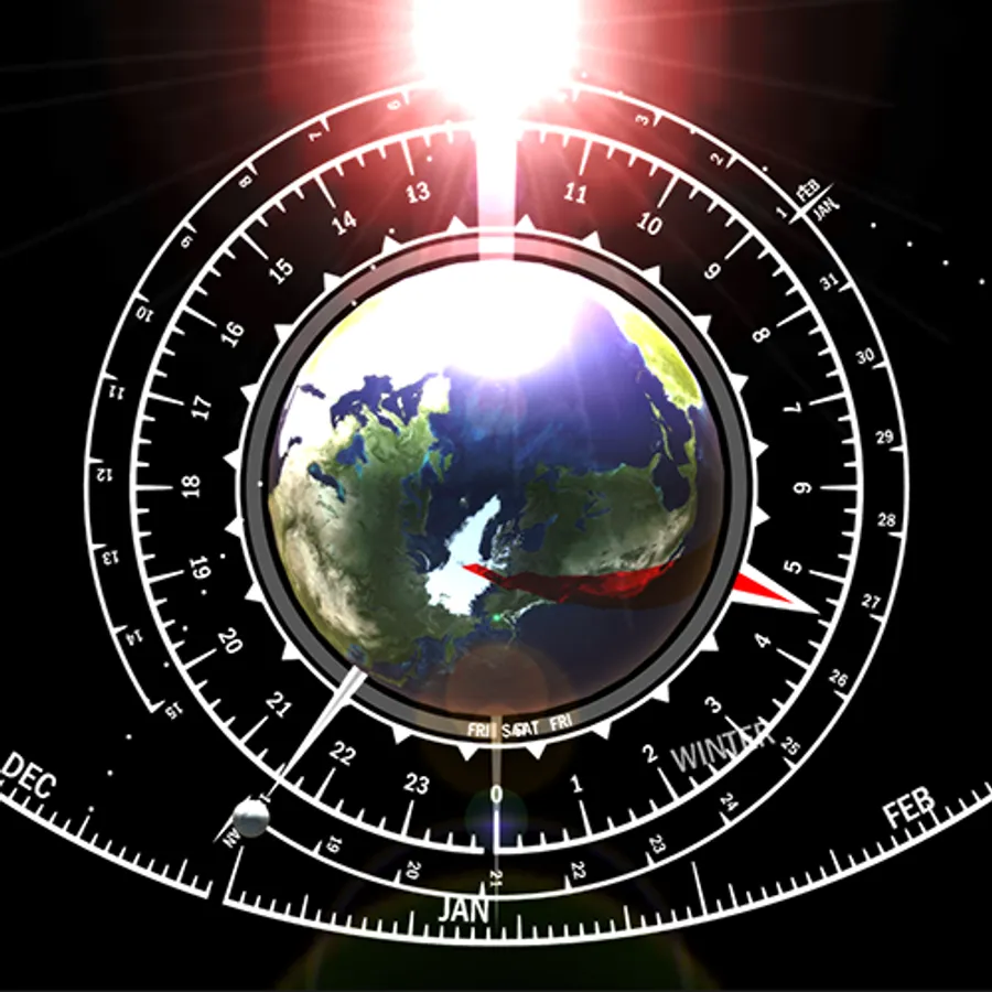 An astronomical clock that shows the position of the Earth and inner planets from an overhead view. A second view state shows a 24 hour clock around the Earth.