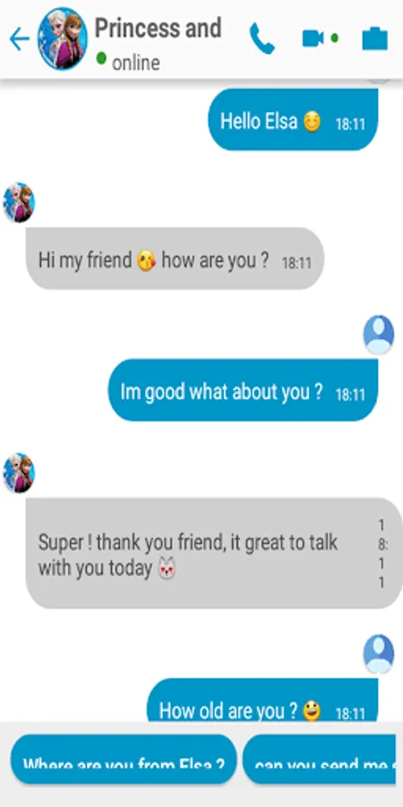 Fake chat and call with Princess and Elssa is a simple application directed to fans Princess and Elssa, it very easy to used just choose your option calling and create a wonderful discussion chat cat with Princess and Elssa with fake video calling and live chat with manu contact hero of Elssa or black cat.