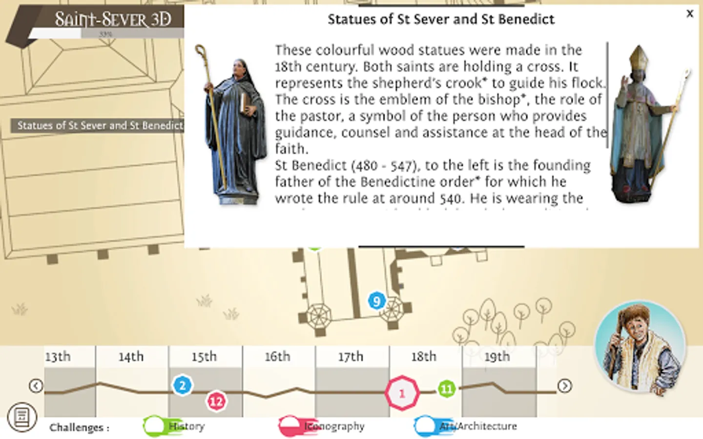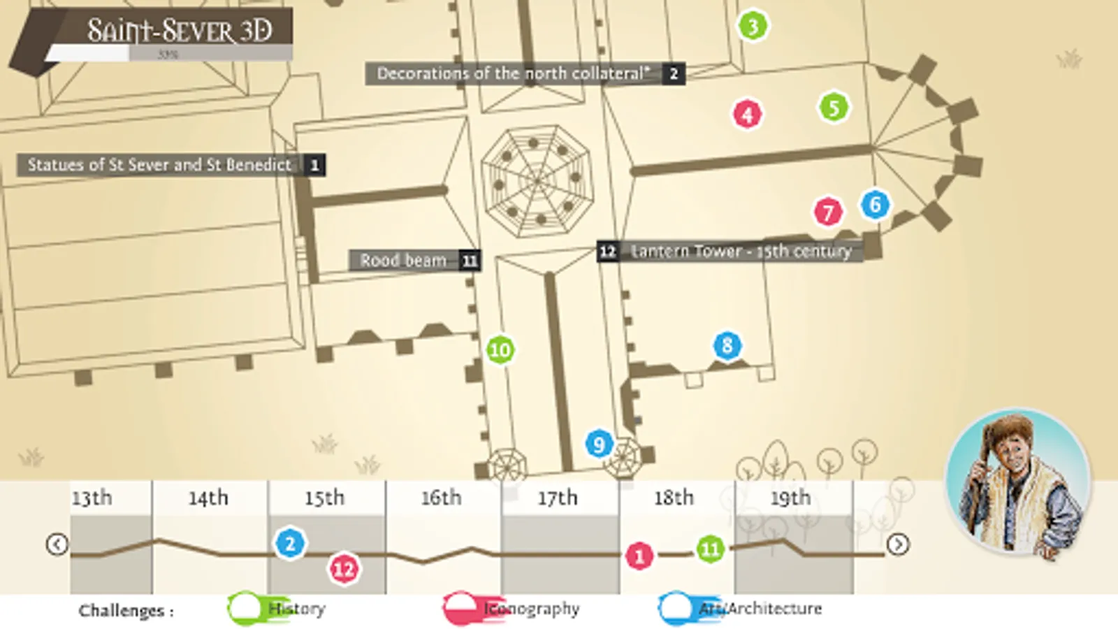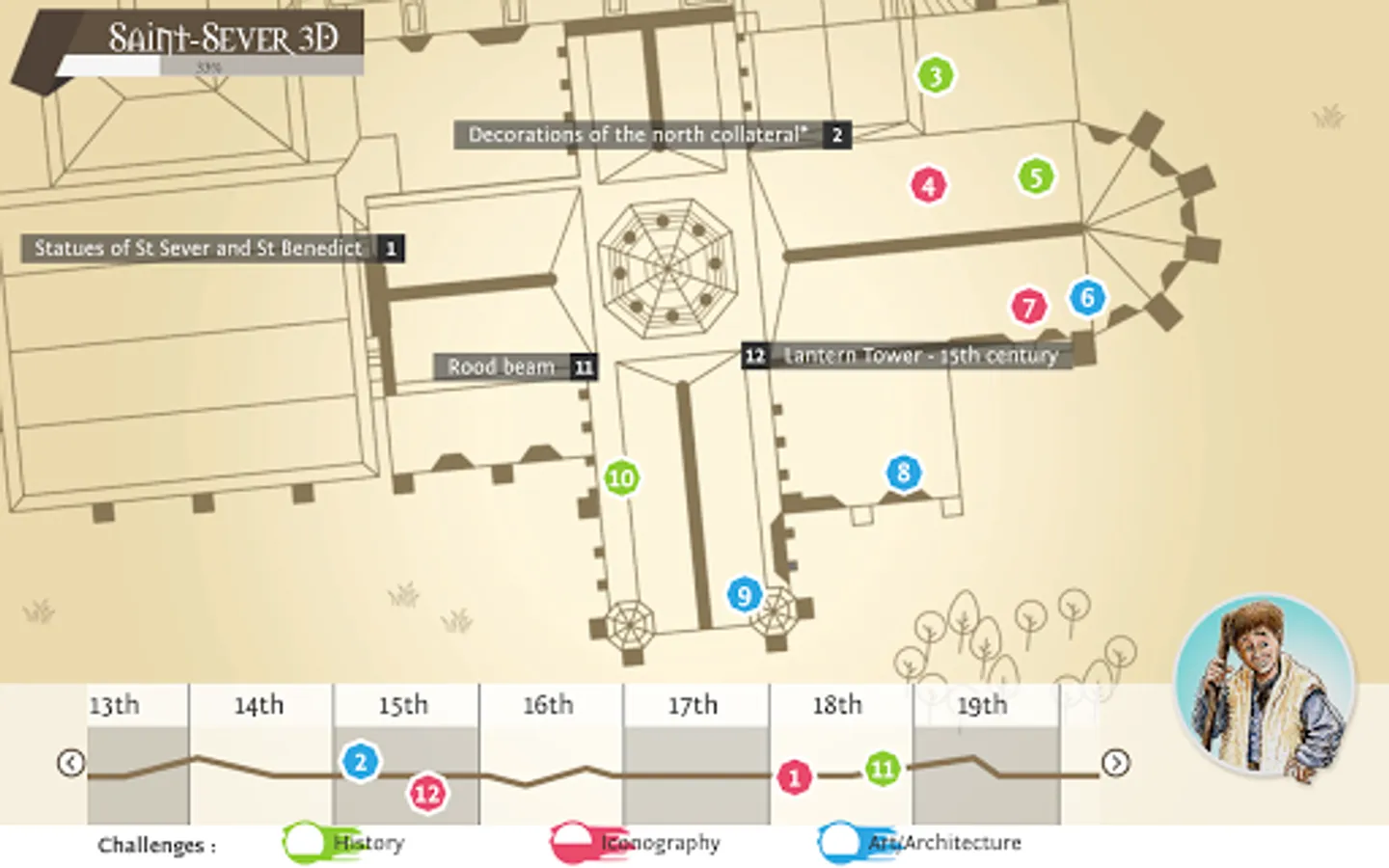 Saint Sever 3D is a ludic tour of the old abbey church of Saint-Sever using augmented reality. This project was carried out within the scope of the Preservation and valorisation of the cultural heritage, supported by the Commune of Noues de Sienne, the Association for the Valorisation of Heritage in the Séverin Region and Les Amis de la Vache qui Lit.