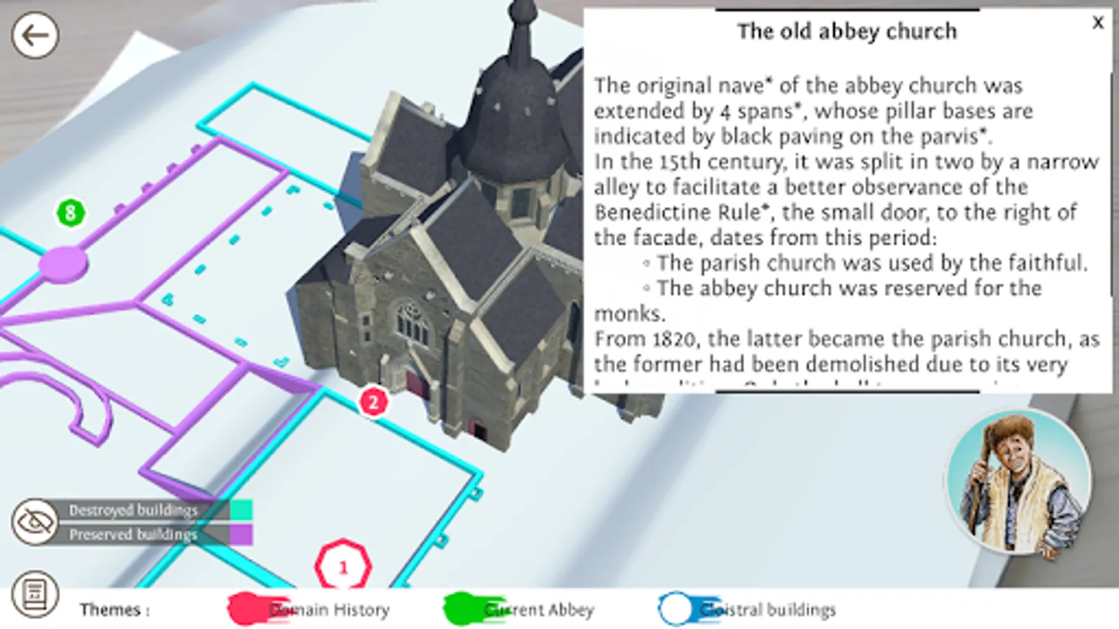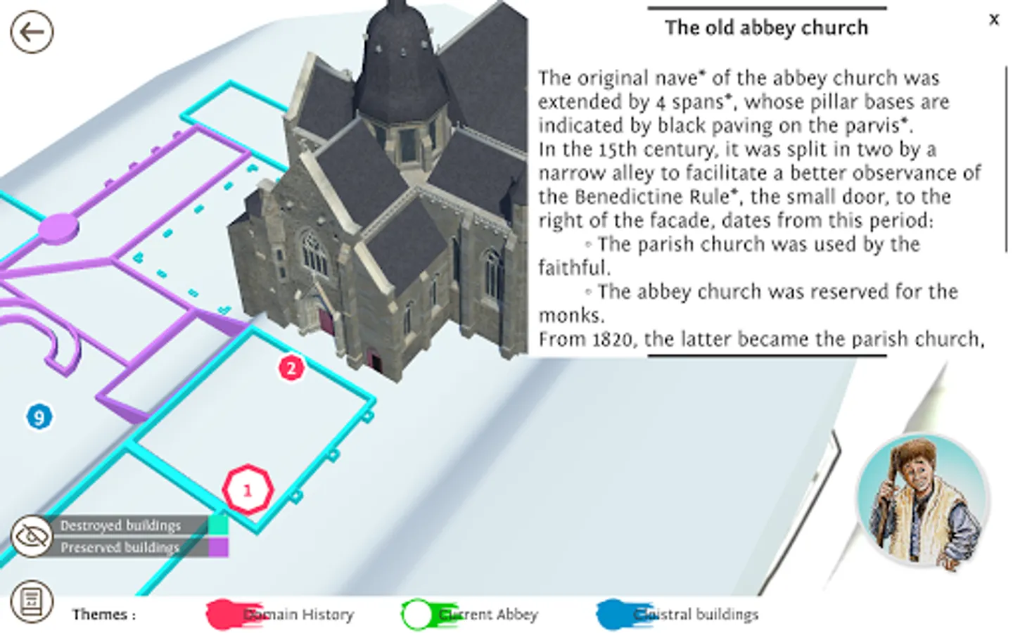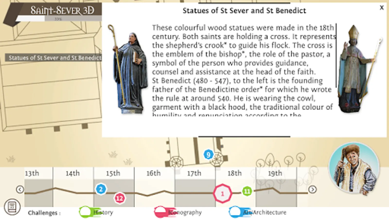 Saint Sever 3D is a ludic tour of the old abbey church of Saint-Sever using augmented reality. This project was carried out within the scope of the Preservation and valorisation of the cultural heritage, supported by the Commune of Noues de Sienne, the Association for the Valorisation of Heritage in the Séverin Region and Les Amis de la Vache qui Lit.