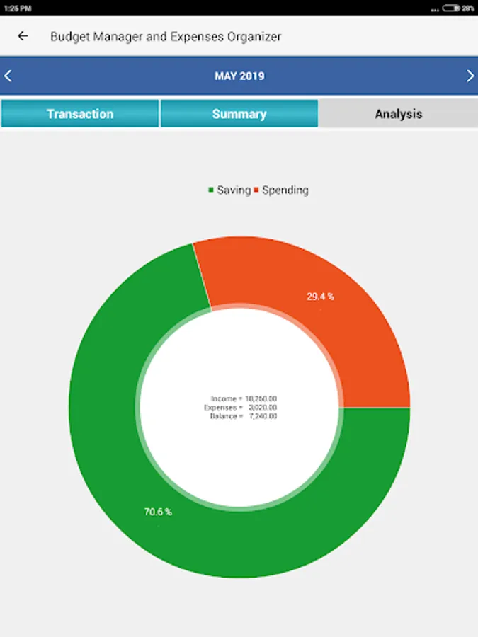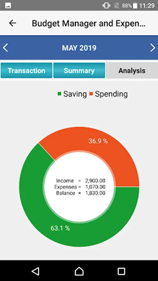 * User can see the total income vs total spending with graphical representation as pie chart.