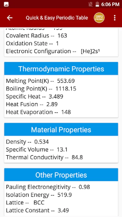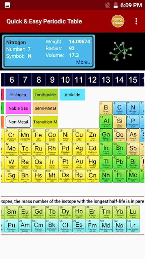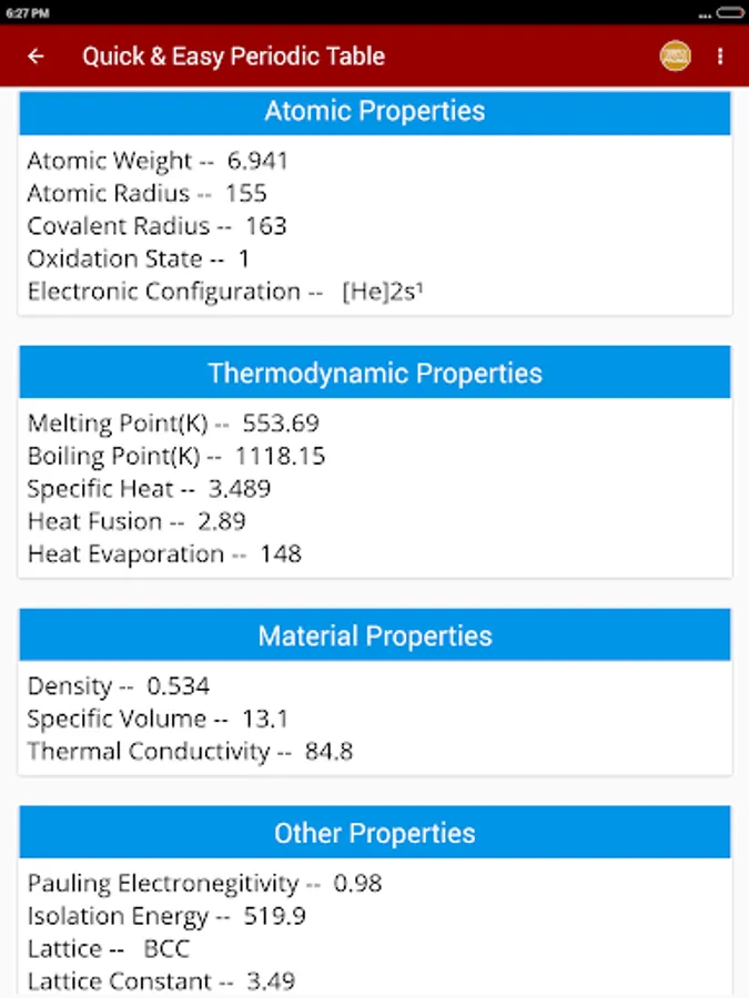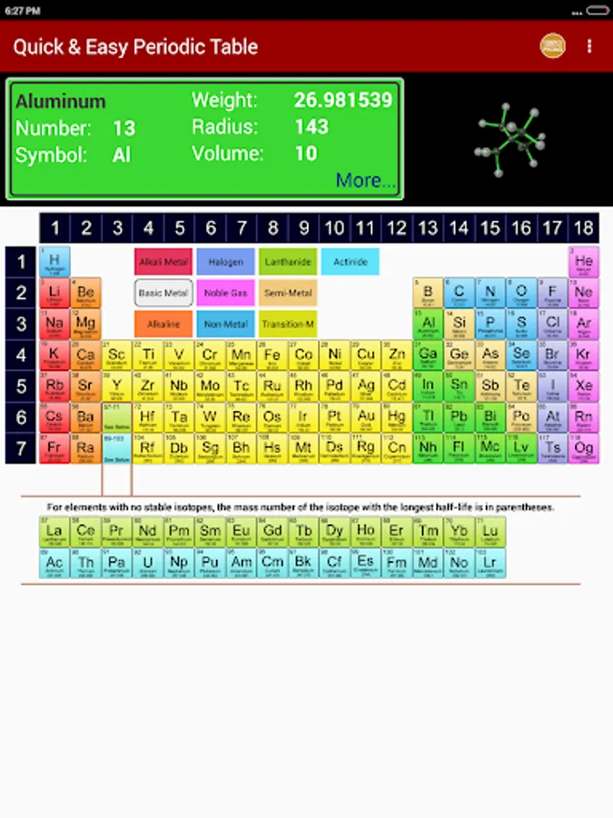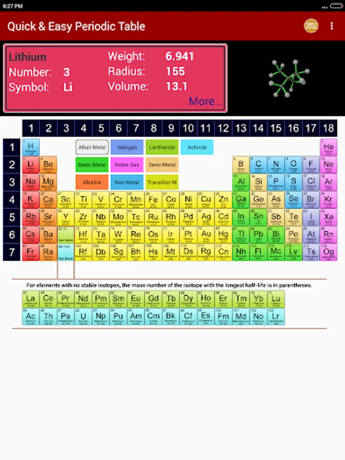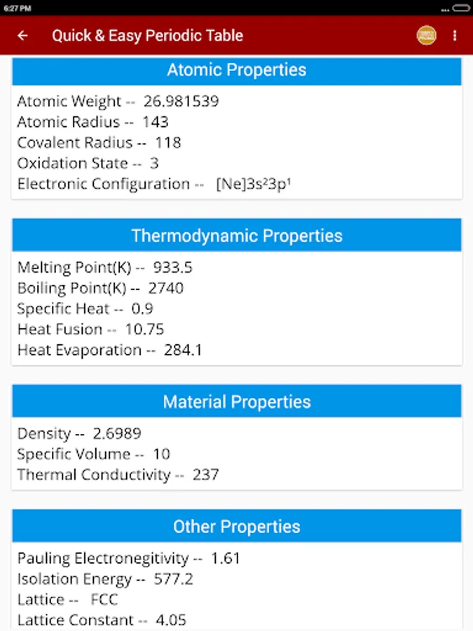 Quick and Easy Periodic Table App is a great learning application for chemistry students. This app allows you to select any element to view the Atomic thermodynamic material electromagnetic nuclear information about that particular element with its atomic number symbol weight radius volume and other atomic properties material properties thermodynamic properties and other properties.