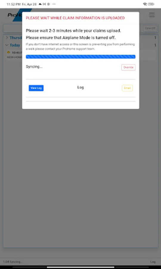 If you are in Airplane mode or an area with poor reception, when you complete the walk, a dialog will appear showing you the progress of the current upload in progress. This helps ensure that your walk gets completely uploaded into the system before you continue with your next walk. If you need to bypass this walk and continue your next walk, you can hit the OVERRIDE button to enter a special code to open the next walk in your list if you want to continue. You will need to call into the office to get the code.