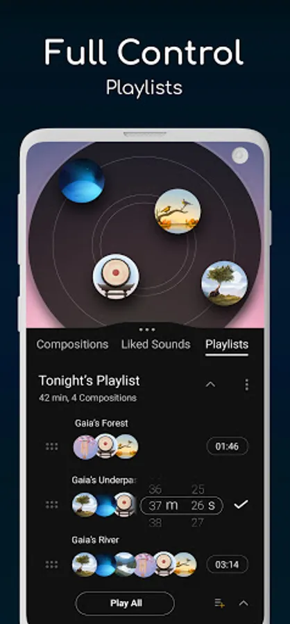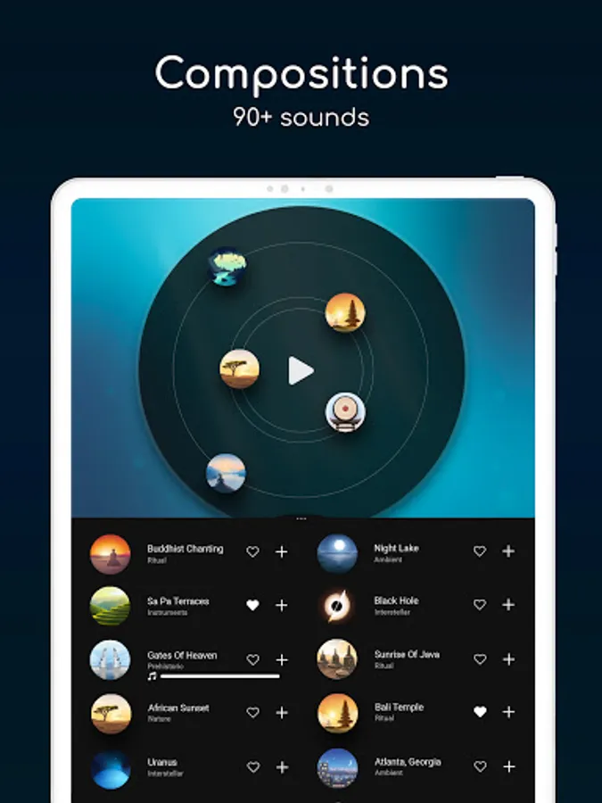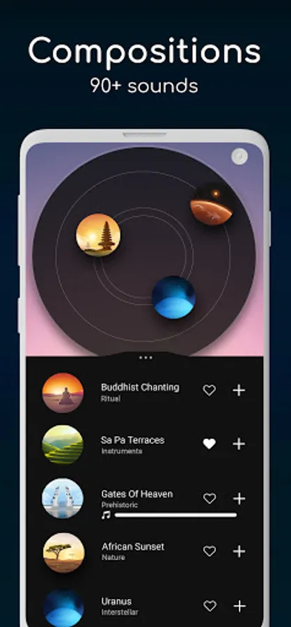You can use it offline to relax and eliminate negativity from your mind. The way it works is you just enter the library, preview the desired peaceful sounds and then add them to your soundboard. It’s creative and rewarding, with results being very immersive and meditative. Are you too tired to create relaxing compositions? No problem! Generate a composition and just enjoy the experience with a single tap on the screen.
