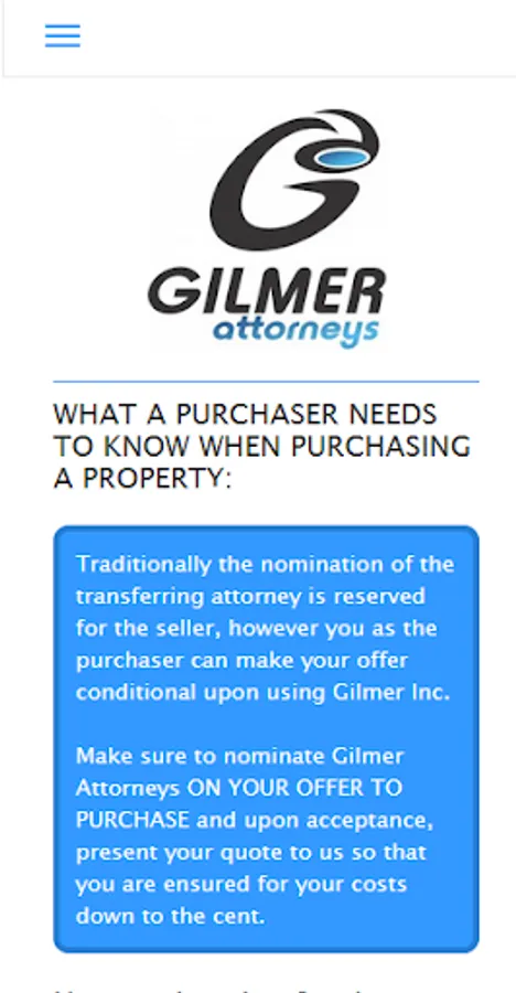 Gilmer inc Attorneys is situated in the heart of Southern Johannesburg. We offer a comprehensive range of legal services for both private individuals and corporate. The firm’s reputation centers around providing competent and responsive legal advice of the highest quality. We achieve this by having an extremely knowledgeable team that has, in excess of 31 years of cumulative experience, ensuring that only service of the upmost quality is given. The utilization of the latest and greatest technology, enables us to facilitate any transaction at the greatest speed and efficiency possible.