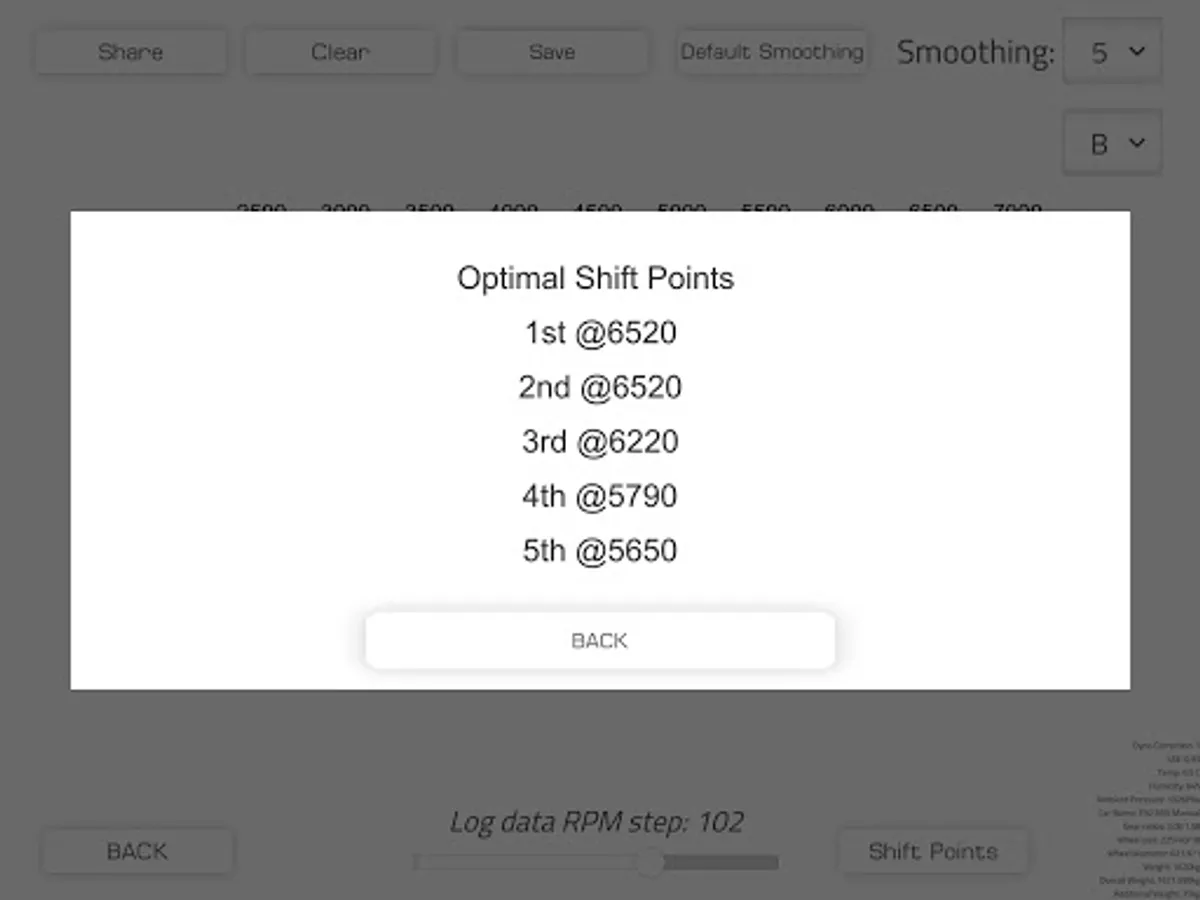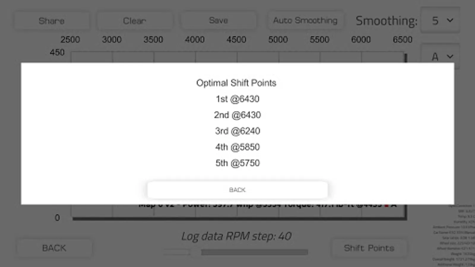 From the torque curve, the app is also able to determine the optimal gear shift points to ensure maximum acceleration. This makes sure you know when to shift, so you always have the most possible power at the wheels.
