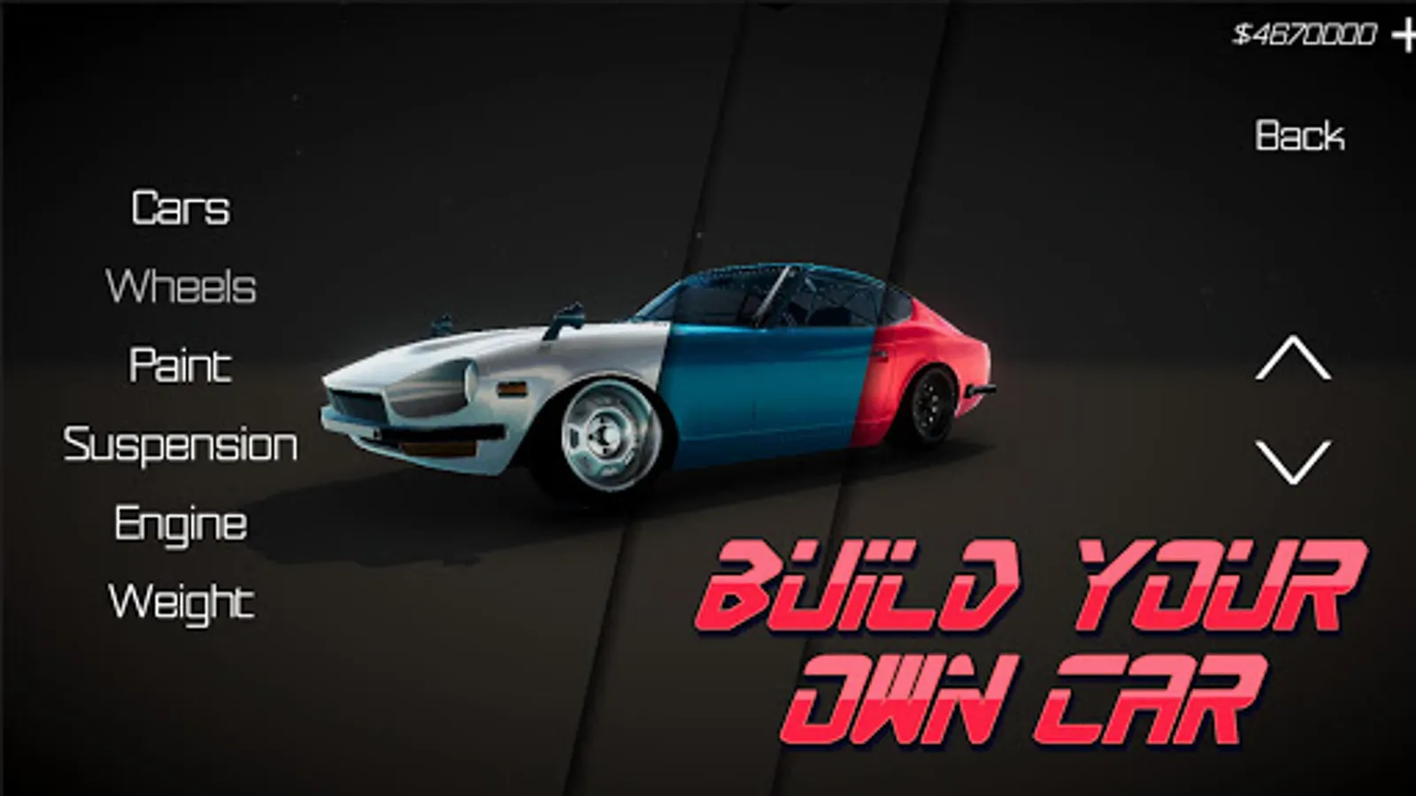 You can select from 6 iconic Nissan cars, and build your ultimate drift missile. You can tune the engine, modify the whole suspension set up, front camber, rear camber, offset, ride height. You can also do weight reduction which you can do for really cheap and experience that power is not everything, and how much easier you can handle your car after dropping some weight from it.