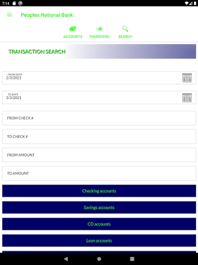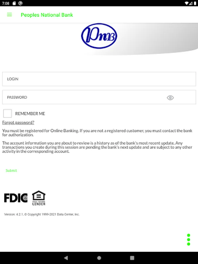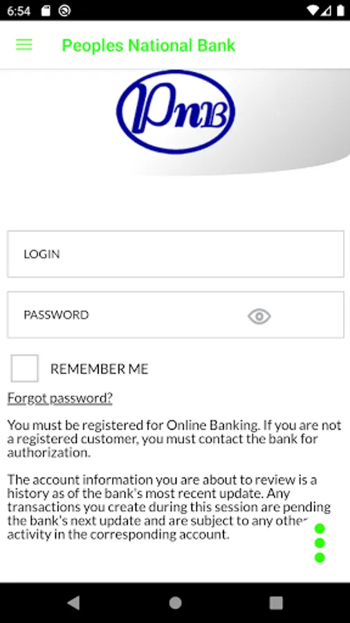 The PNB App from Peoples National Bank allows you to easily access your accounts at your fingertips! With your FREE PNB APP you can view your balances and transaction history, as well as perform funds transfers and loan payments. You must be a registered Internet banking customer to utilize this app.