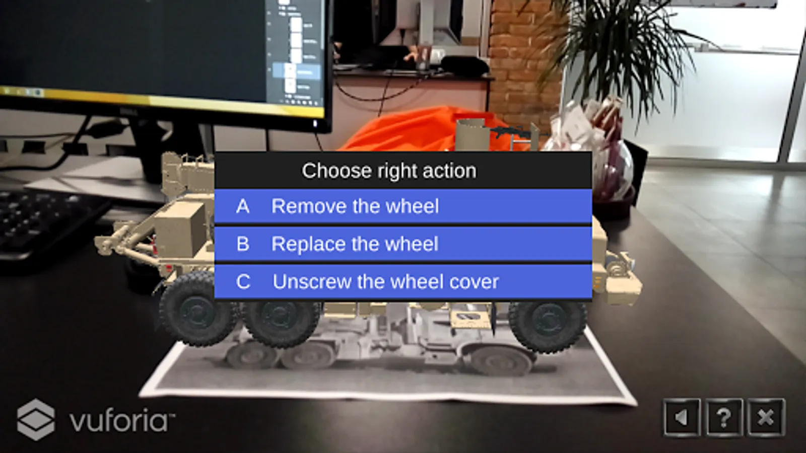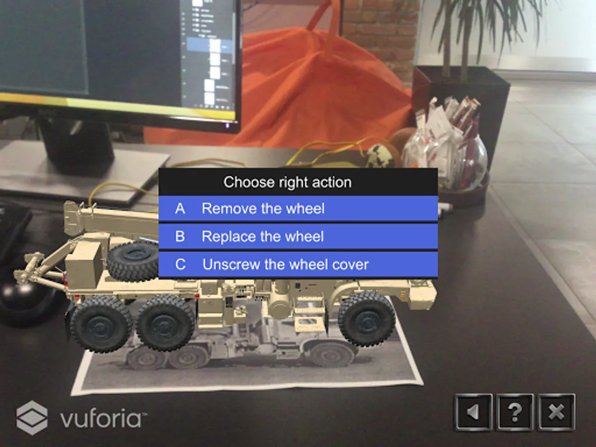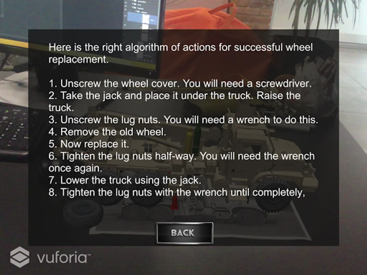 The application guides you through which tools are appropriate at different steps in the process of of replacing a wheel and you will learn the best approach to this task. Augmented Reality will make your experience even more realistic as will work on a life-like truck!