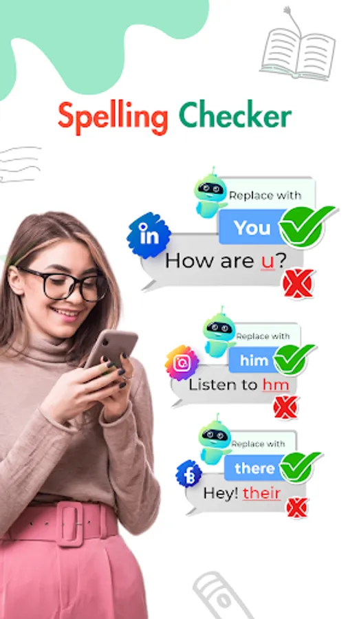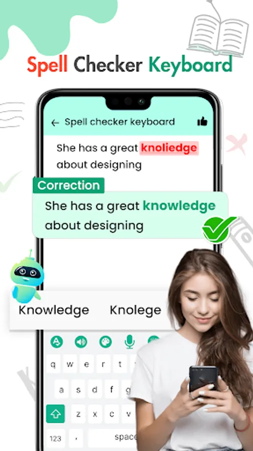 Don't worry about misspelling words again. Spell Check keyboard or correct spelling checker provides you with an accurate spell check, highlight misspelled words and autocorrect them. English Spell Checker keyboard provides you with spelling suggestions for each word that helps you to confidently write essays 📝, messages 💬, social media posts 📱, compose emails 📩, and other text without any errors.