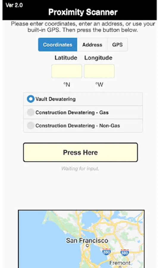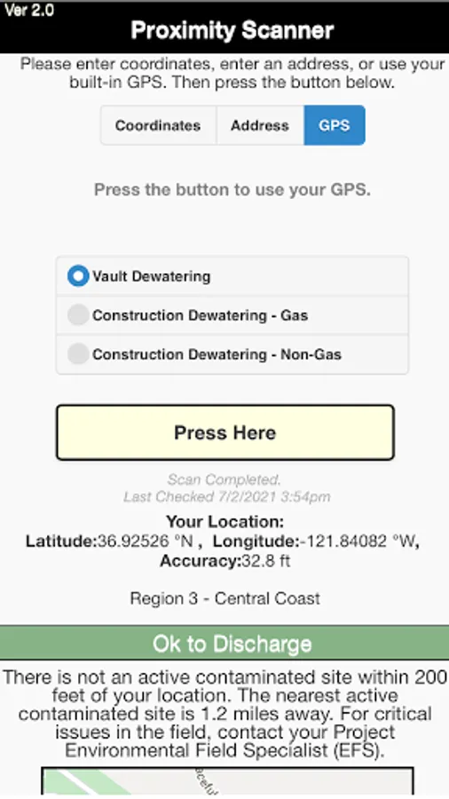 The Proximity Scanner is intended for use by PG&E employees and contract-staff. The app uses your phone's GPS to verify WDR permit coverage and local Cortese-site locations. It considers the extent of each Regional Water Quality Control Board and the Cortese-sites (Government-listed hazardous materials sites) within PG&E’s service area in California. The Proximity Scanner App is to be used in conjunction with the Vault Dewatering form as part of the vault dewatering procedure and helps PG&E Employees and Contractors determine if clean vault water may be discharged to land in certain locations after land owner approval is received and documented.