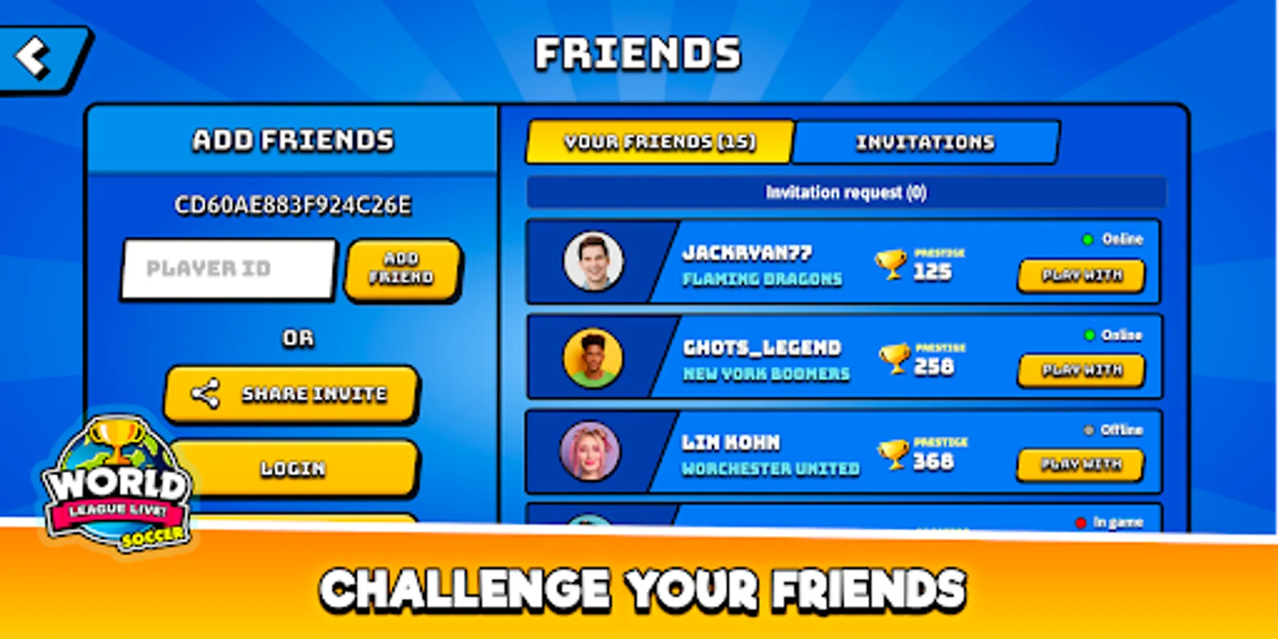 Join World League Live, the fastest-paced and craziest social multiplayer soccer game where you can challenge your friends and thousands of real opponents around the world.