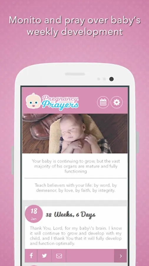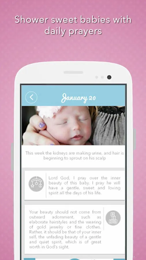This app gives you weekly fetal development, a scripture that correlates with development and daily prayers to pray over your bundle of joy.