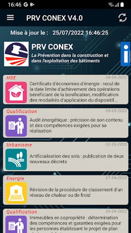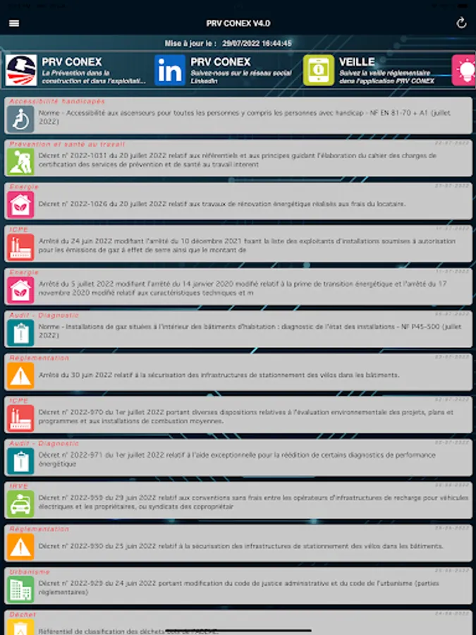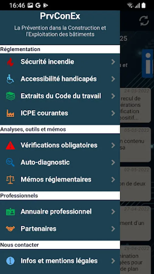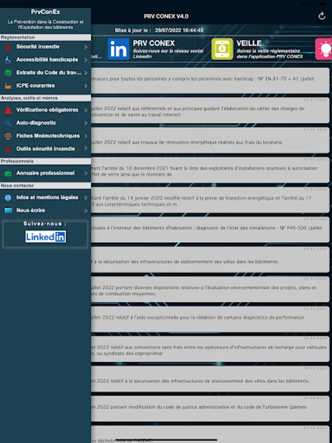 The Prv ConEx application complements official or commented works and contains regulatory texts in the field of fire safety, accessibility for disabled people, extracts from the Labor Code and the most common ICPE orders.