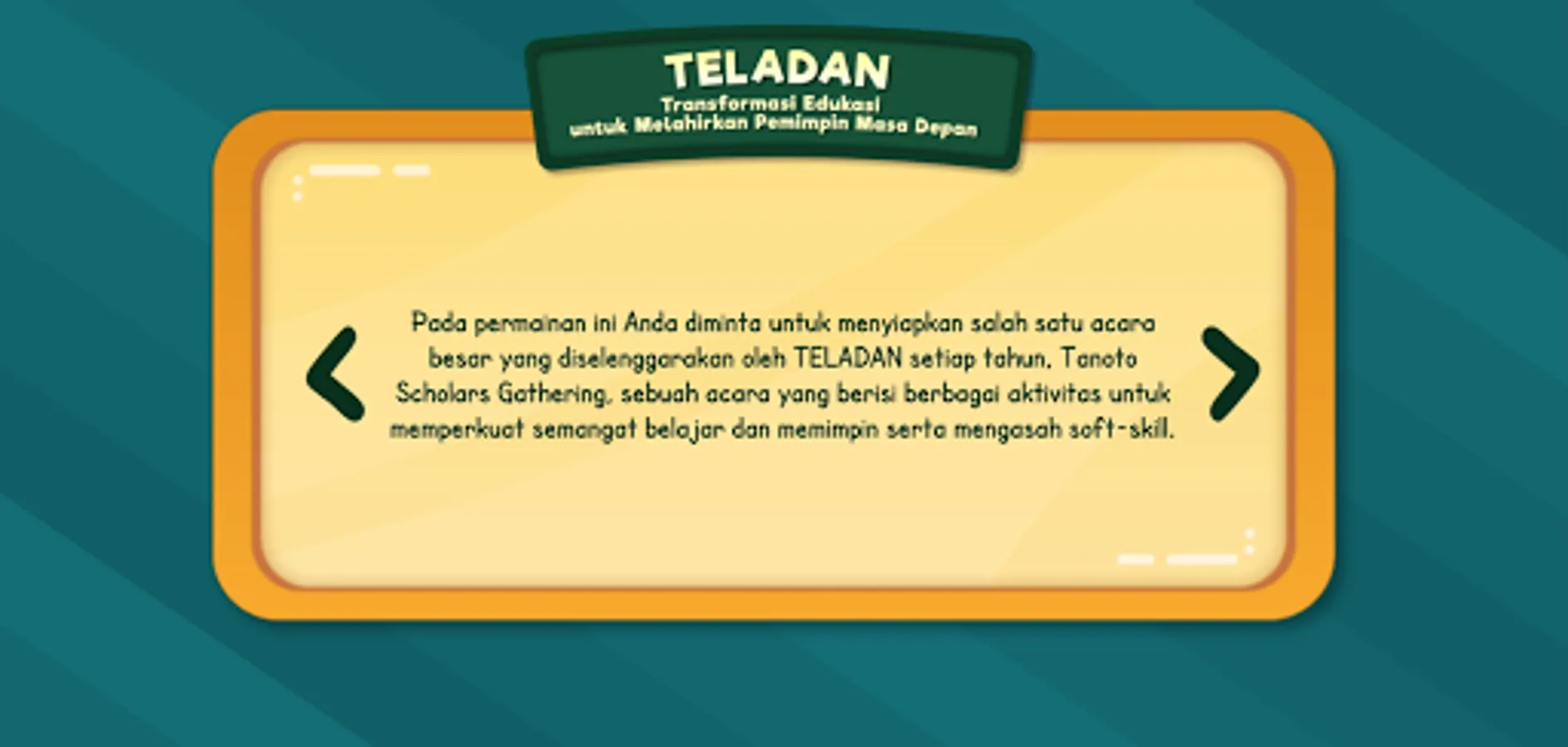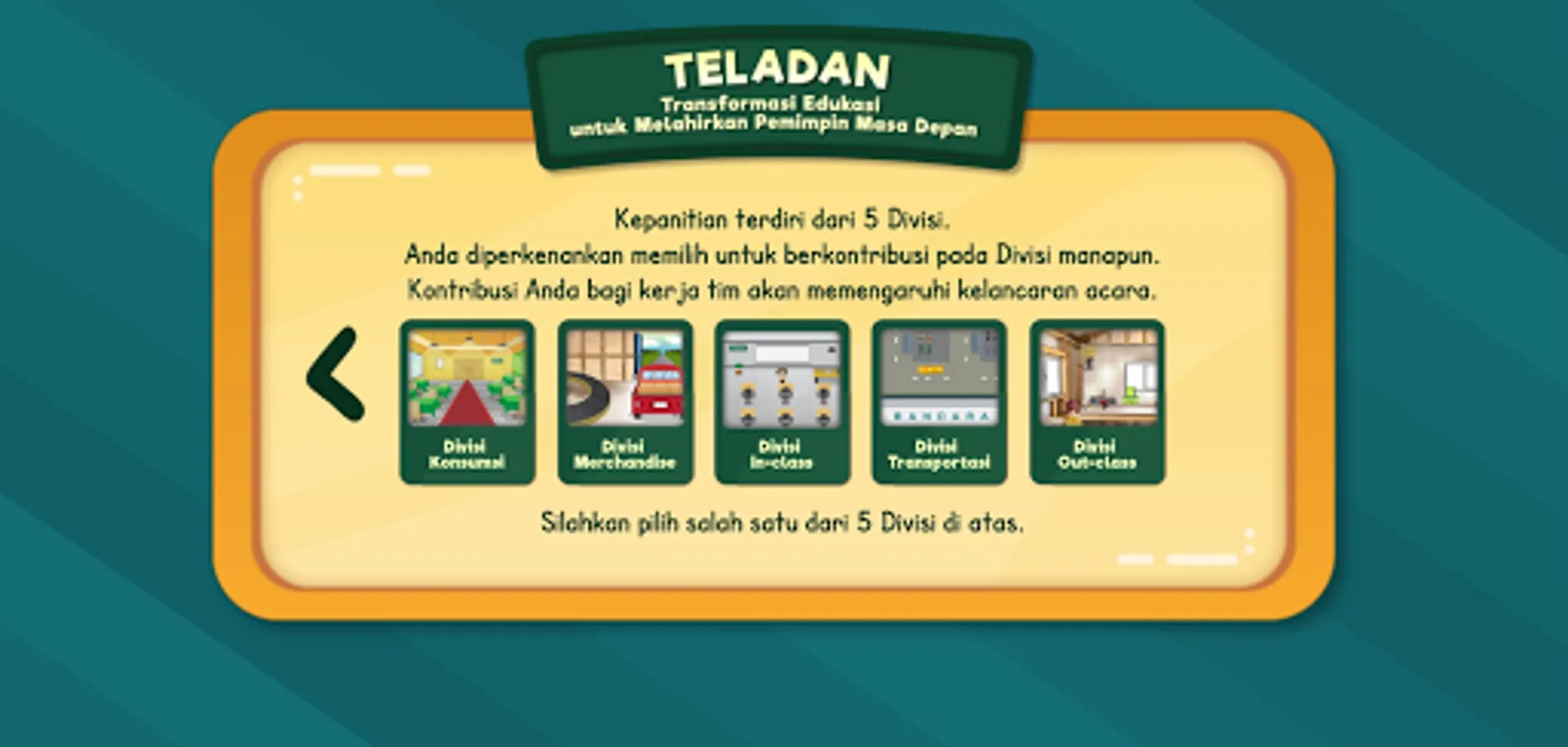 In this stage you act as part of the Tanoto Scholars Gathering team. This team consists of the Transportation Division, Consumption Division, Merchandise Division, In-Class Division, and Out-Class Division. Increase the points in each division, so that the mission of each division is fulfilled