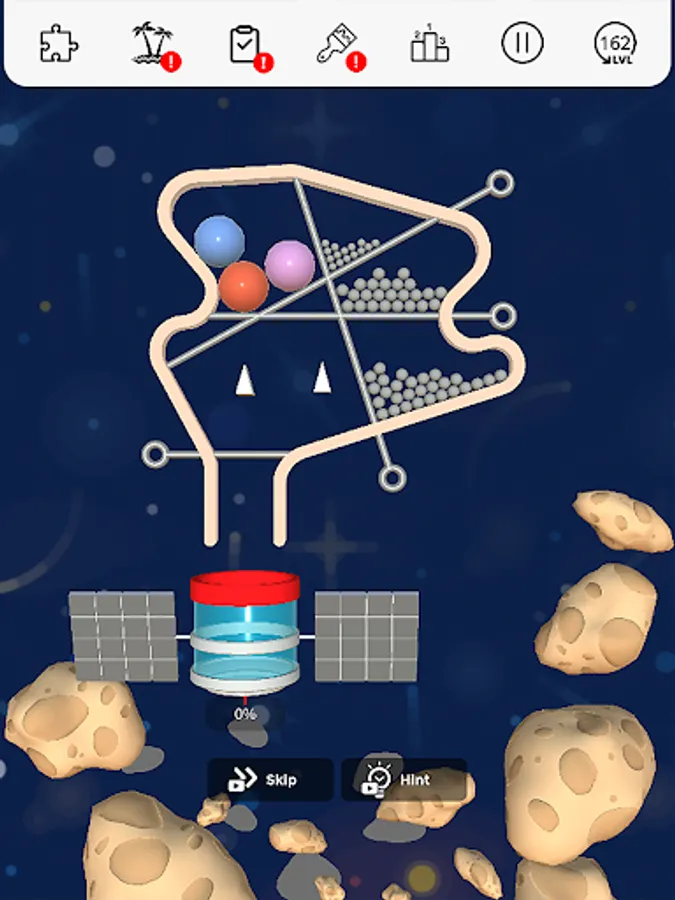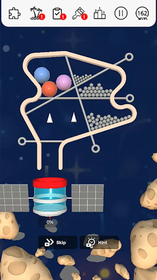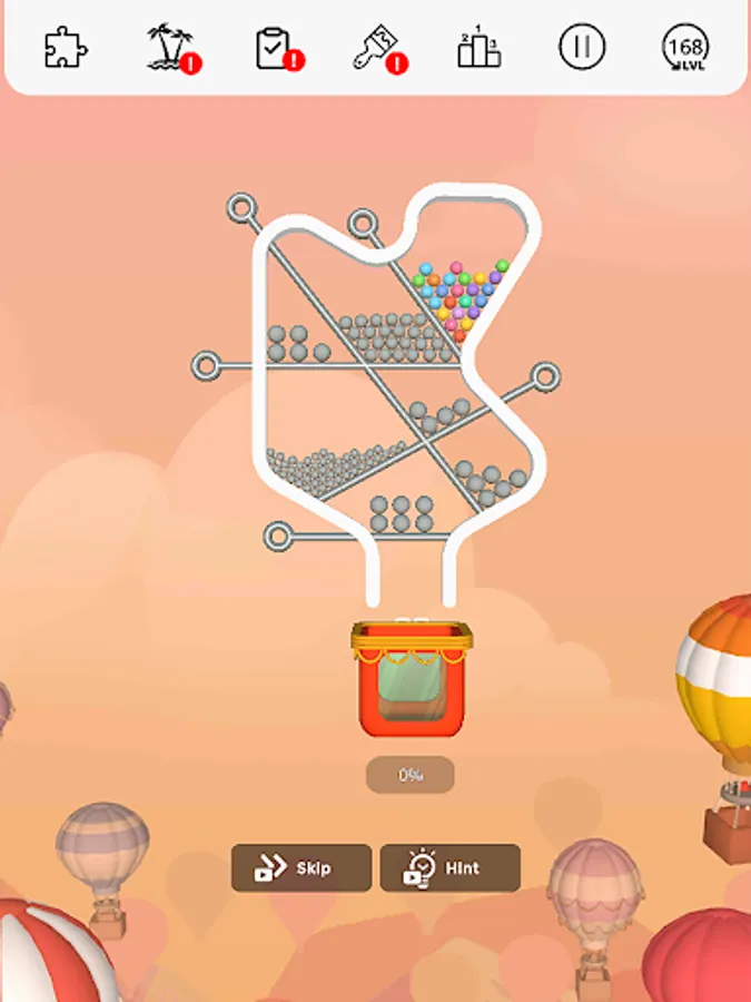 Remove all pins in the correct order to get the balls into the cup. Can you make it?