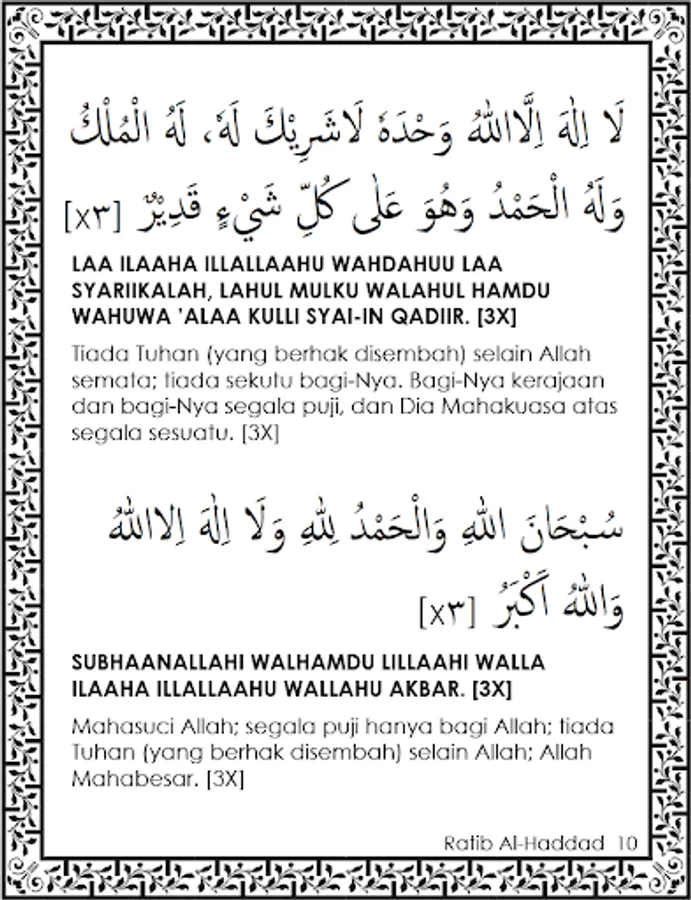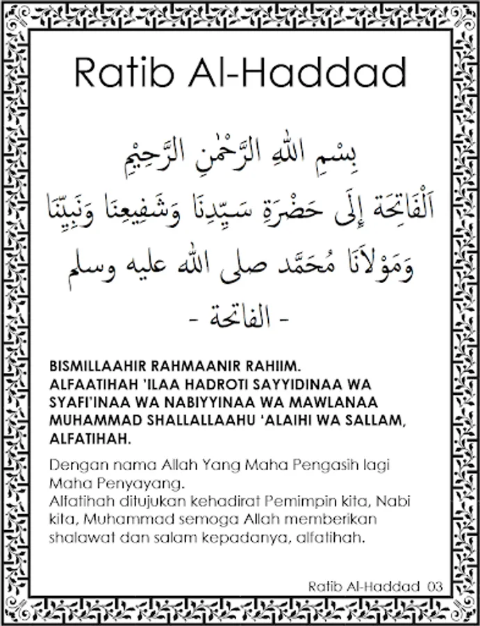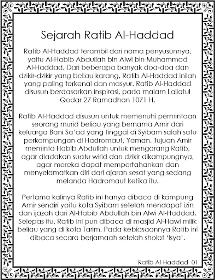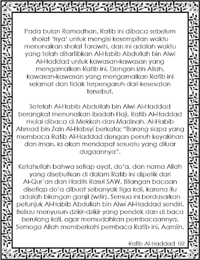 Inilah Ratib Al-Haddad karya Termasyur al-Imam al-Qutub al-Habib Abdullah bin Muhammad bin Alwi Al-Haddad. Berkata Al-Habib Ahmad bin Zain Al-Habsyi; "Barang siapa yang membaca Ratib Al-Haddad ini dengan penuh keyakinan dan iman, ia akan mendapat sesuatu yang di luar dugaannya".
