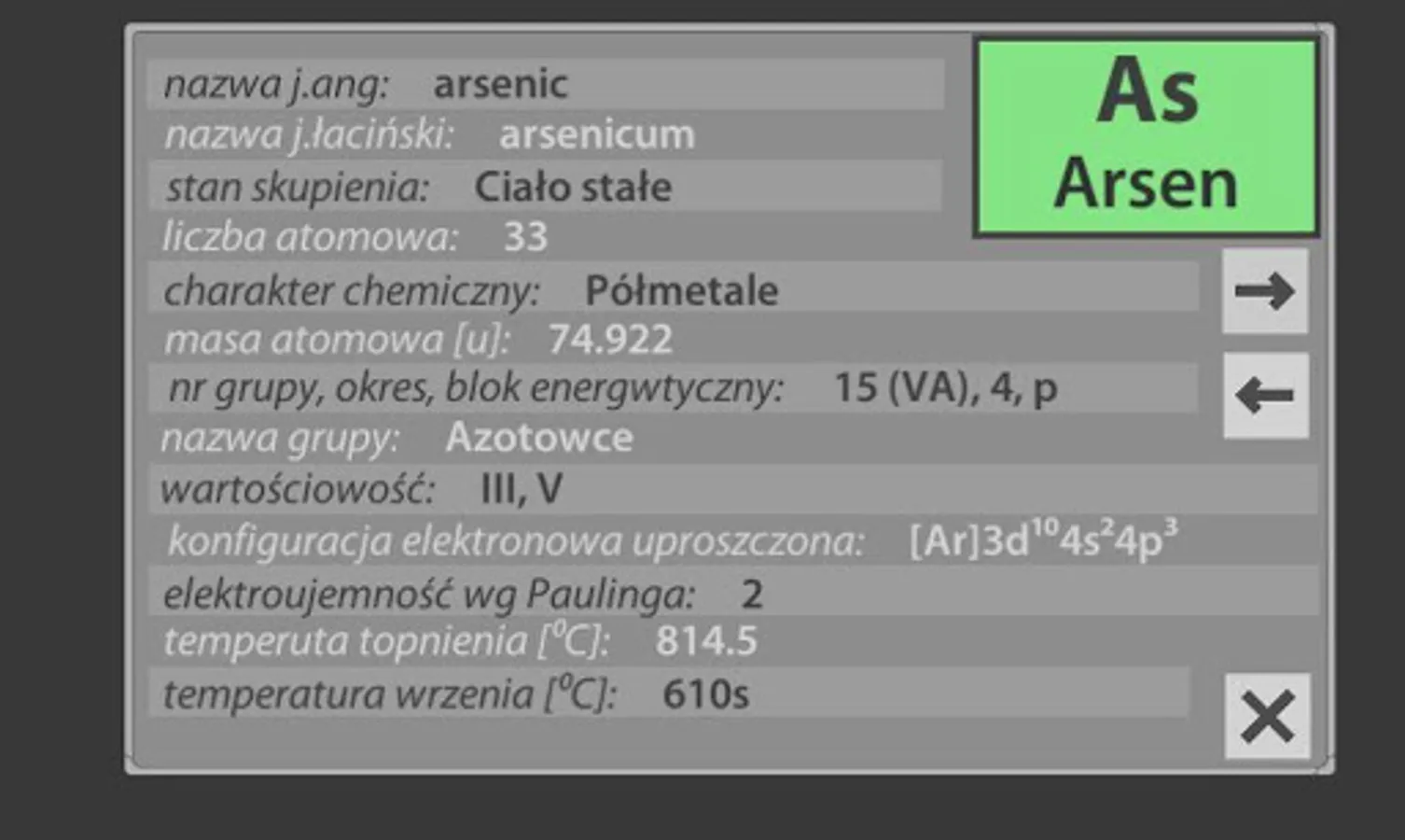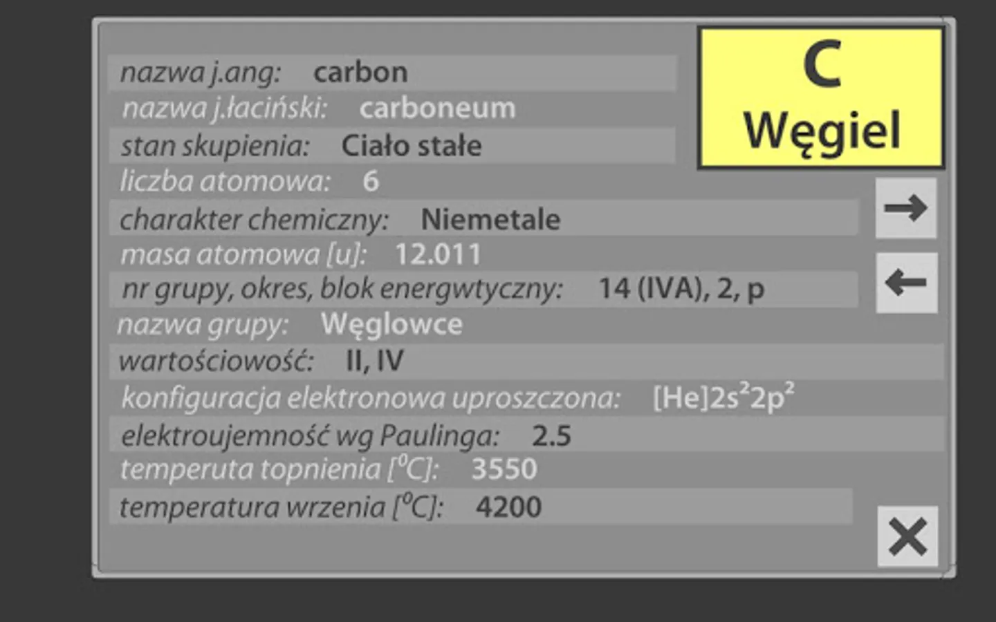 Move your finger to zoom in and out of the Mendeleev's board. Select the root element and read its basic data and properties: